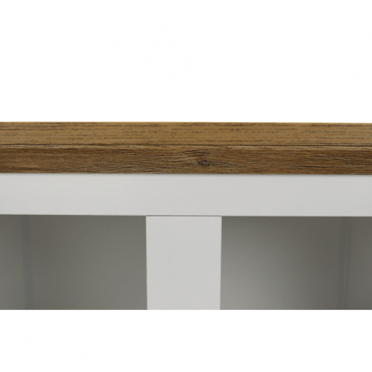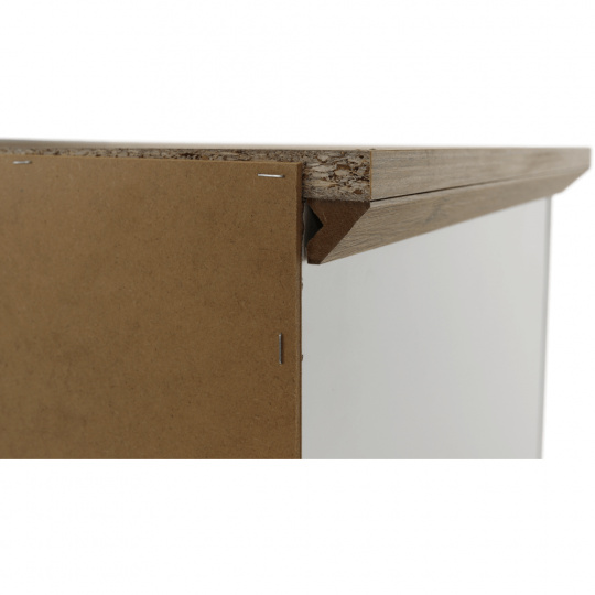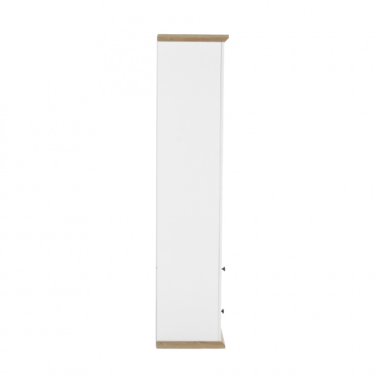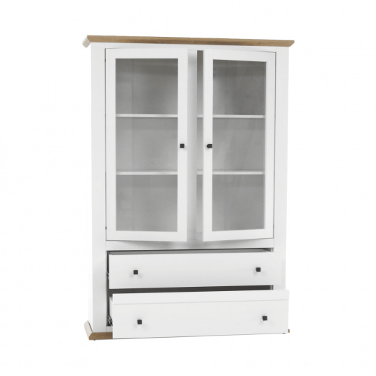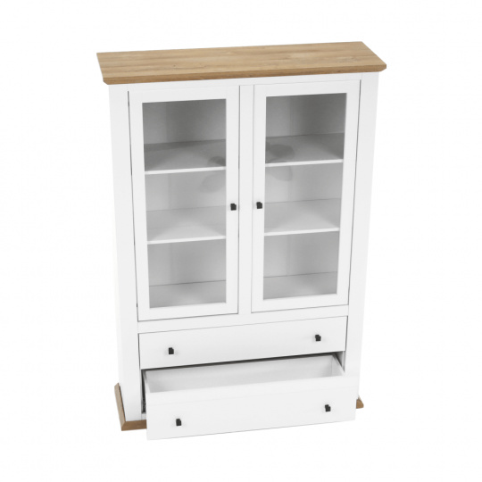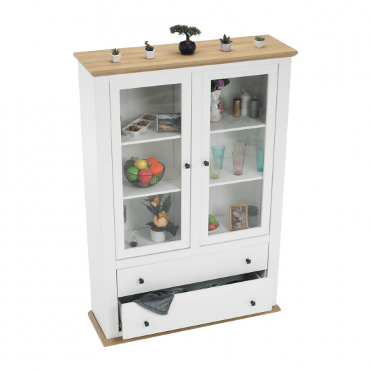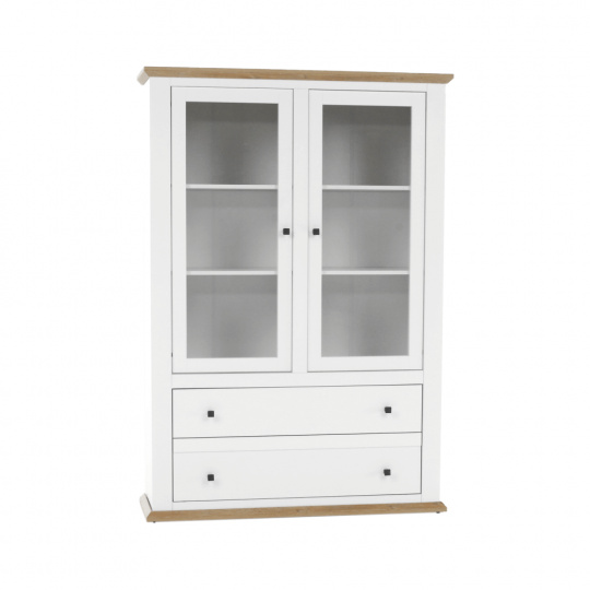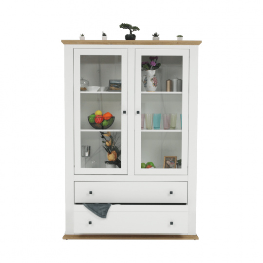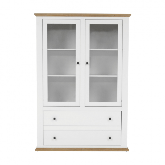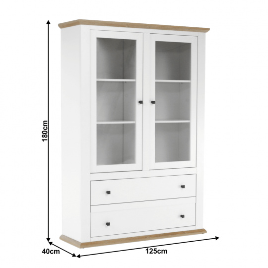 Materiál: DTD laminovaná / ABS hrany Barva: bílá / dub grand Rozměry (ŠxHxV): 125x40x180 cm Tloušťka materiálu: 40 mm dvoudveřová Dveskrinky prosklená S policemi dva šuplíky S úchytkami S 3D efektem elegantní V provensálském stylu kovové úchytky Dodávané v demontu