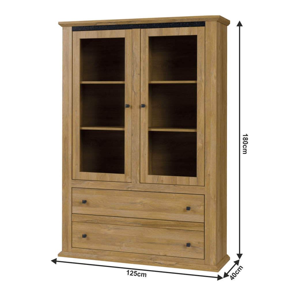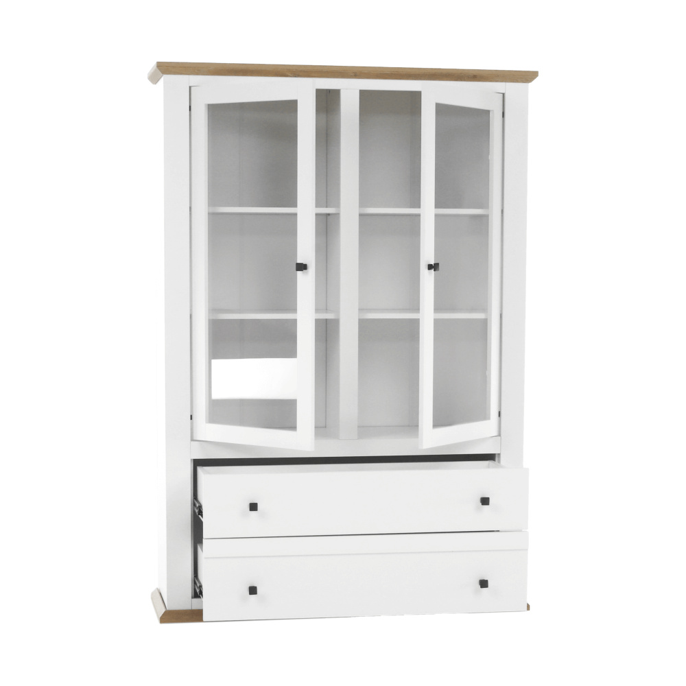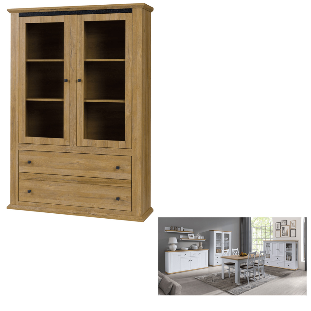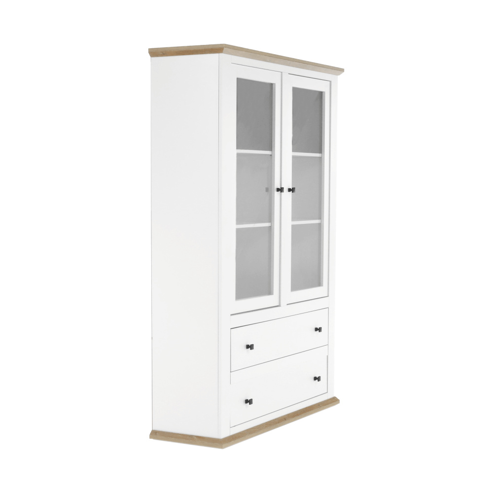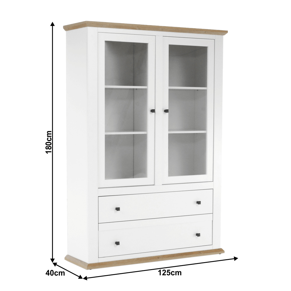 Materiál: DTD laminovaná / ABS hrany Barva: bílá / dub grand Rozměry (ŠxHxV): 125x40x180 cm Tloušťka materiálu: 40 mm dvoudveřová Dveskrinky prosklená S policemi dva šuplíky S úchytkami S 3D efektem elegantní V provensálském stylu kovové úchytky Dodávané v demontu