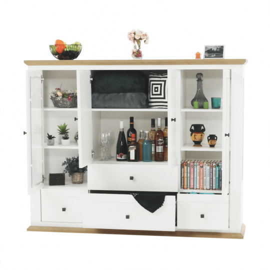 Materiál: DTD laminovaná / ABS hrany Barva: bílá / dub grand Rozměry (ŠxHxV): 165x40x130 cm Tloušťka materiálu: 40 mm čtyřdveřová čtyři skříňky prosklená S policemi čtyři šuplíky S úchytkami S 3D efektem elegantní V provensálském stylu kovové úchytky Dodávané v demontu