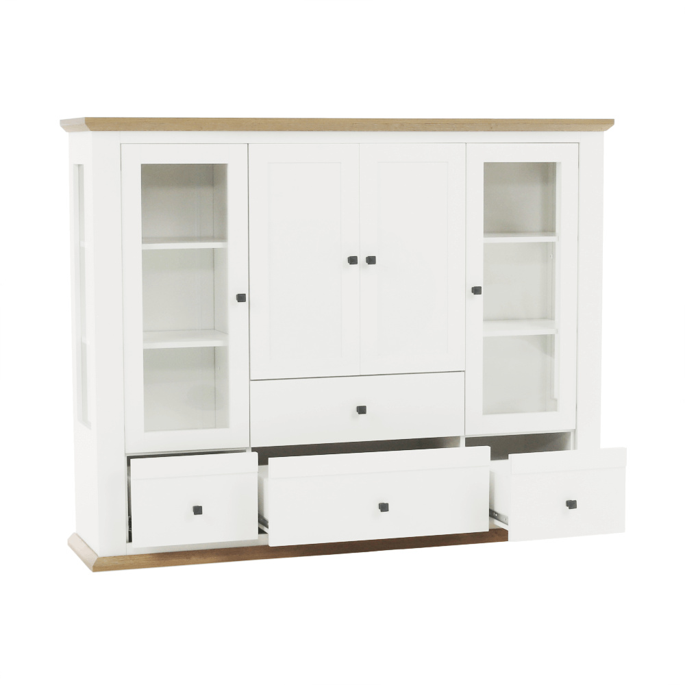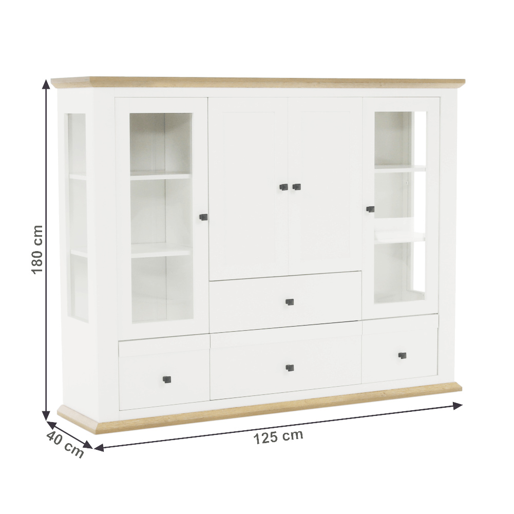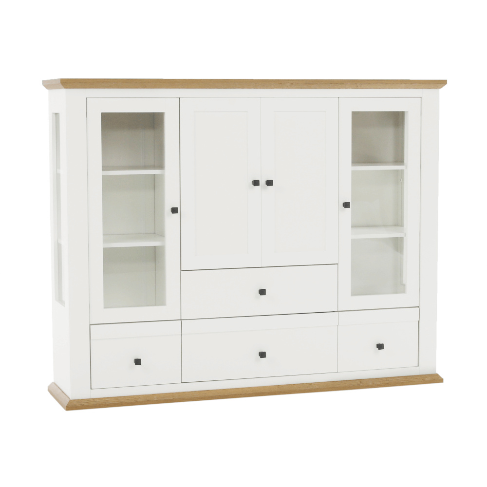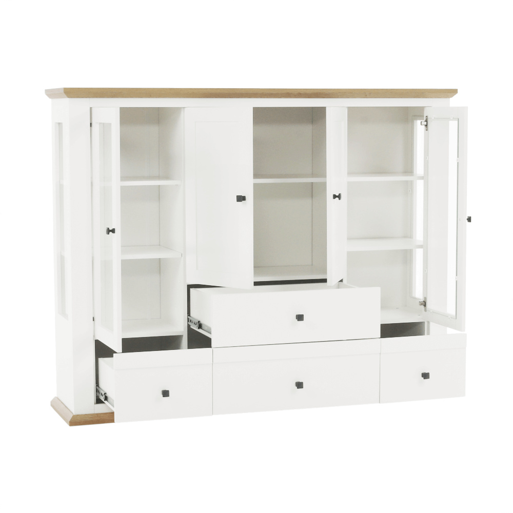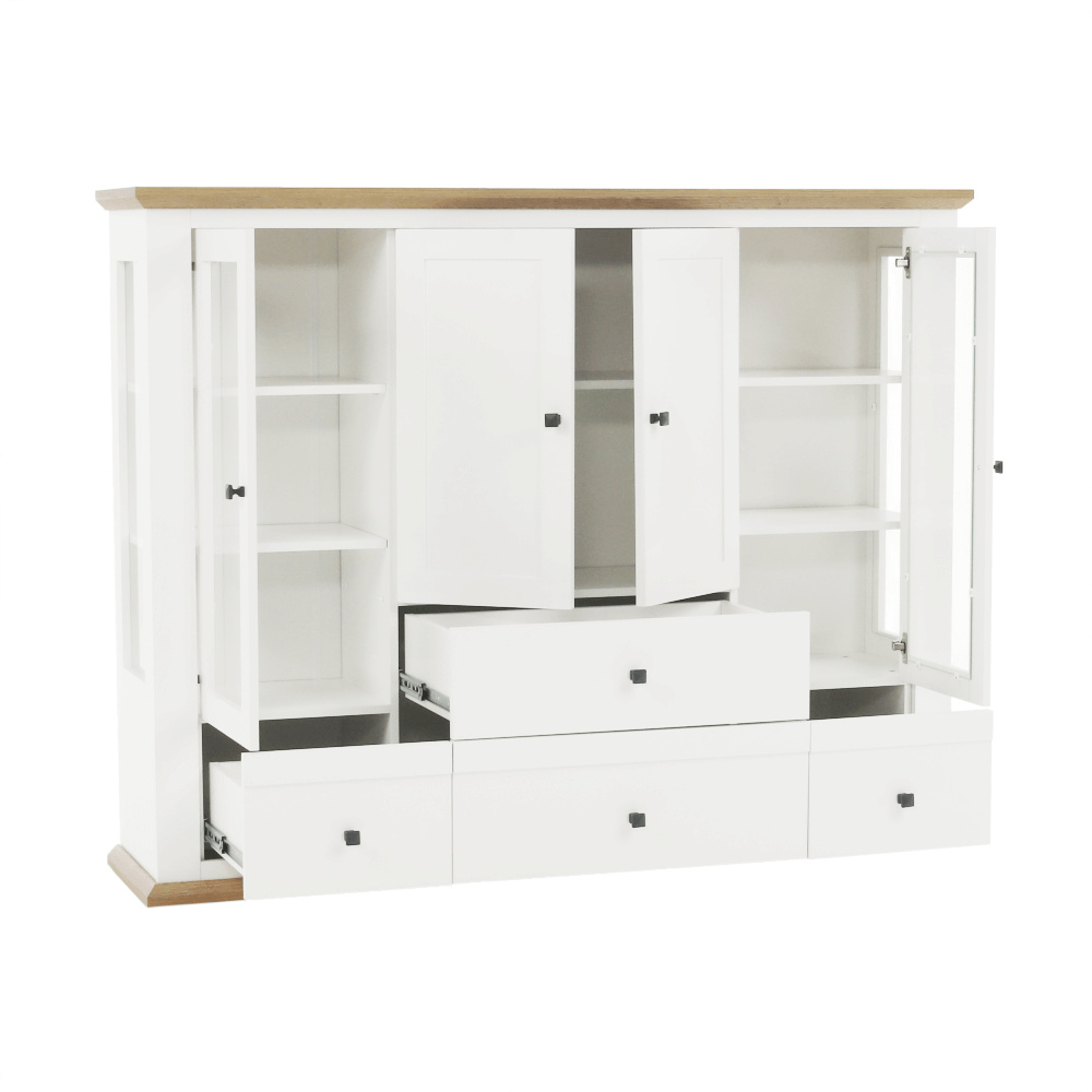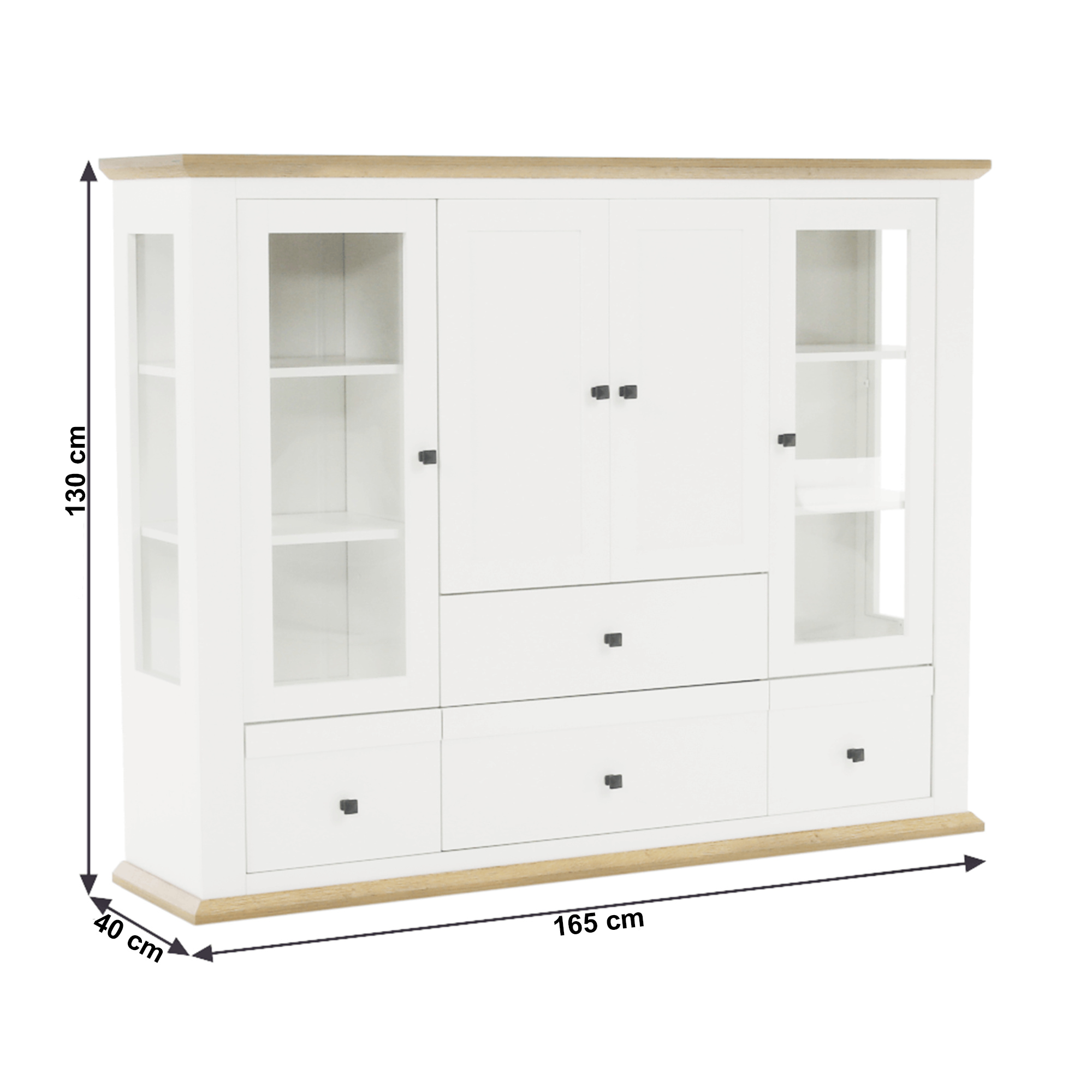 Materiál: DTD laminovaná / ABS hrany Barva: bílá / dub grand Rozměry (ŠxHxV): 165x40x130 cm Tloušťka materiálu: 40 mm čtyřdveřová čtyři skříňky prosklená S policemi čtyři šuplíky S úchytkami S 3D efektem elegantní V provensálském stylu kovové úchytky Dodávané v demontu