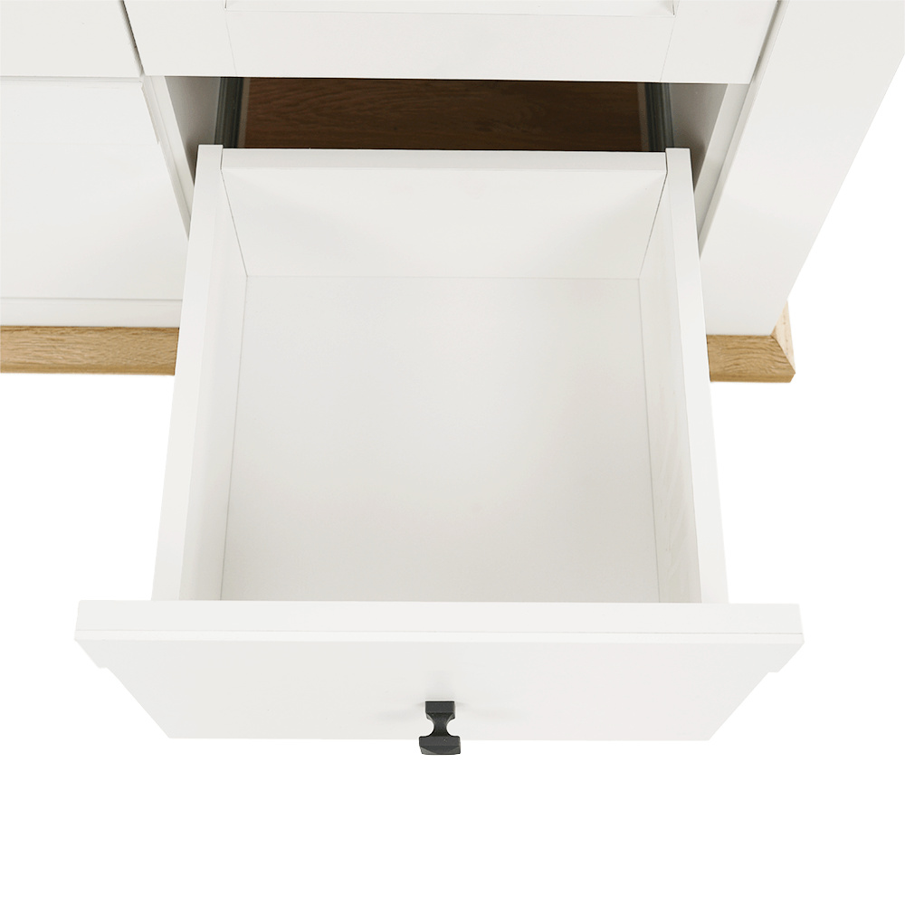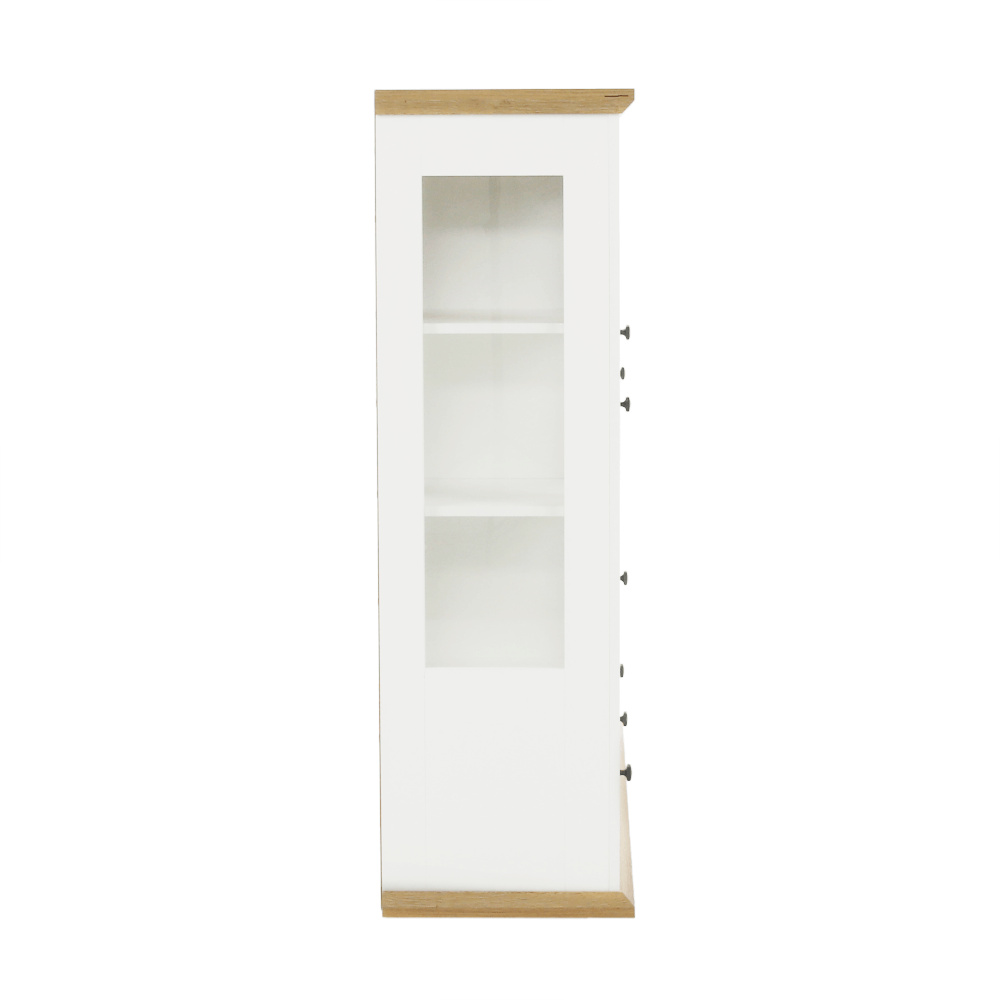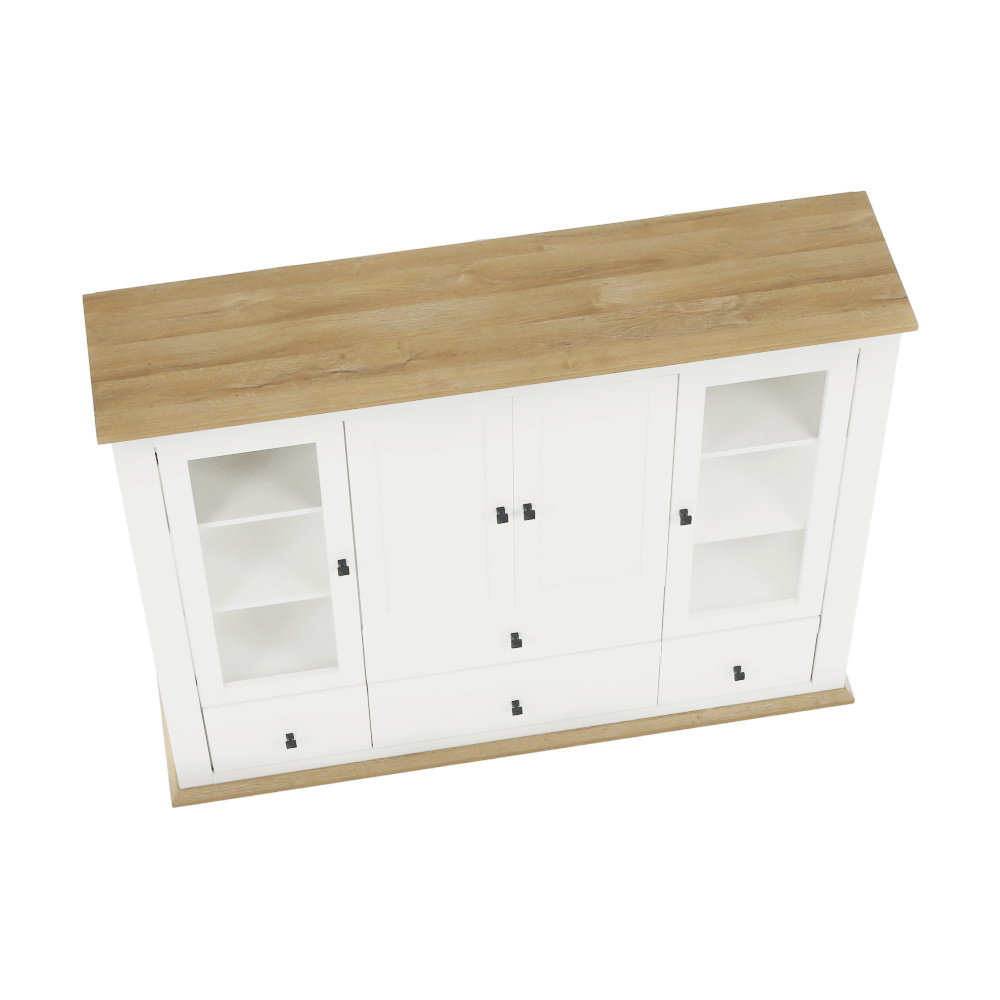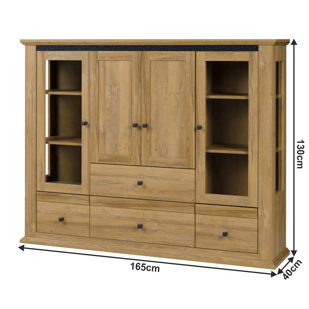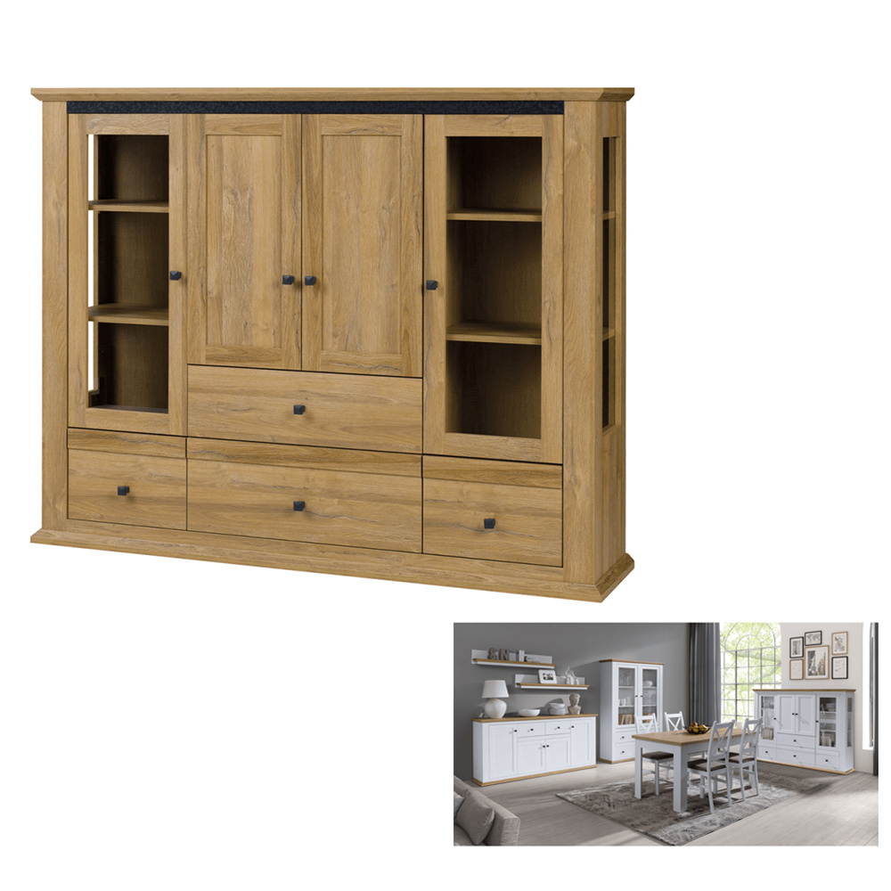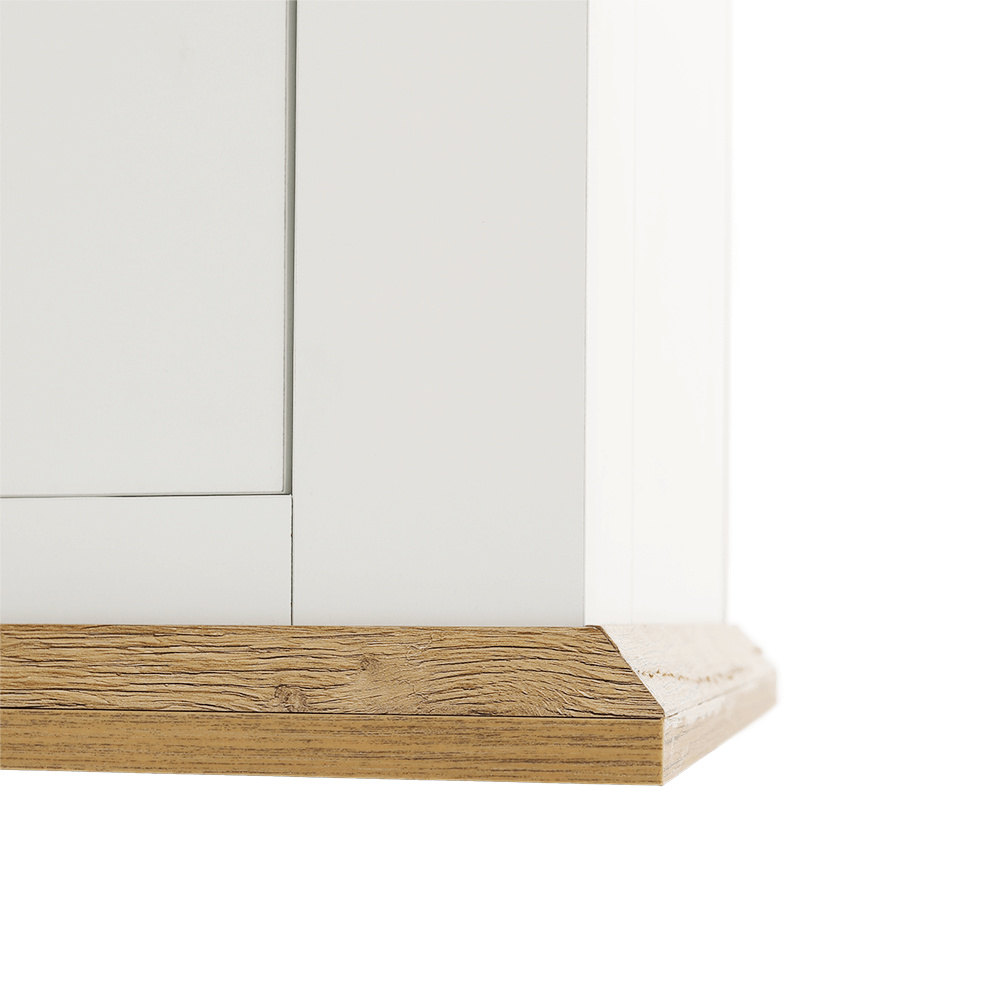 Materiál: DTD laminovaná / ABS hrany Barva: bílá / dub grand Rozměry (ŠxHxV): 165x40x130 cm Tloušťka materiálu: 40 mm čtyřdveřová čtyři skříňky prosklená S policemi čtyři šuplíky S úchytkami S 3D efektem elegantní V provensálském stylu kovové úchytky Dodávané v demontu
