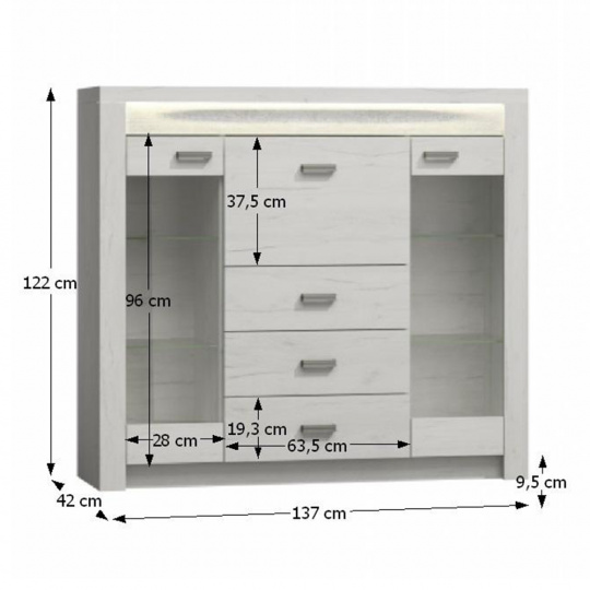 Komoda 10 z luxusního sektorového nábytku Korpus hrubý až 48 mm, Tloušťka materiálu zbývající části: 16 mm, úchytky kovové Materiál DTD laminovaná, ABS hrany, barevné provedení: jasan bílý, Rozměry ŠxHxV: 96x42x72,5 cm. Možnost dokoupení LED osvětlení v ceně 890 Kč. Dodávané v demontu. Hmotnost: 31.5kg