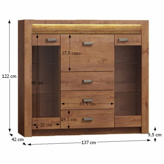 Komoda s vitrínami Inifinity 08 Korpus hrubý až 48 mm, Tloušťka materiálu zbývající části: 16 mm, úchytky kovové Materiál DTD laminovaná, ABS hrany, barevné provedení: jasan světlý, Rozměry ŠxHxV: 137x42x122 cm. Podsvícená deska z masivního dřeva Dodávané bez LED osvětlení Možnost dokoupení LED osvětlení v ceně 1090 Kč. Dodávané v demontu.