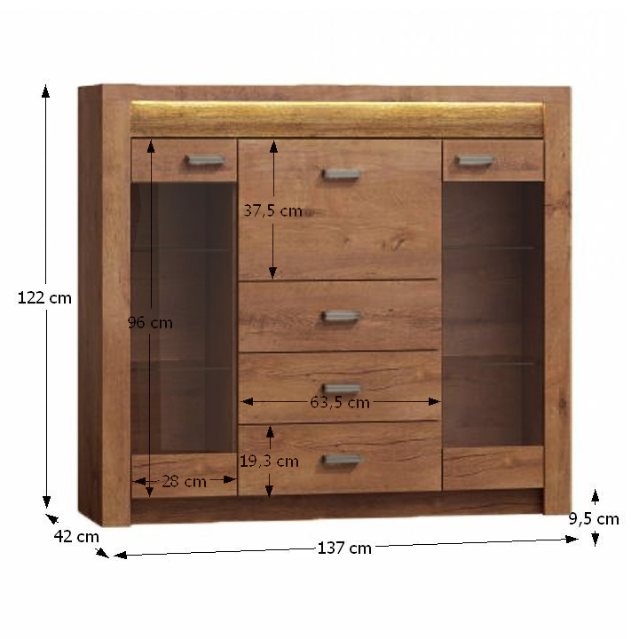 Komoda s vitrínami Inifinity 08 Korpus hrubý až 48 mm, Tloušťka materiálu zbývající části: 16 mm, úchytky kovové Materiál DTD laminovaná, ABS hrany, barevné provedení: jasan světlý, Rozměry ŠxHxV: 137x42x122 cm. Podsvícená deska z masivního dřeva Dodávané bez LED osvětlení Možnost dokoupení LED osvětlení v ceně 1090 Kč. Dodávané v demontu.