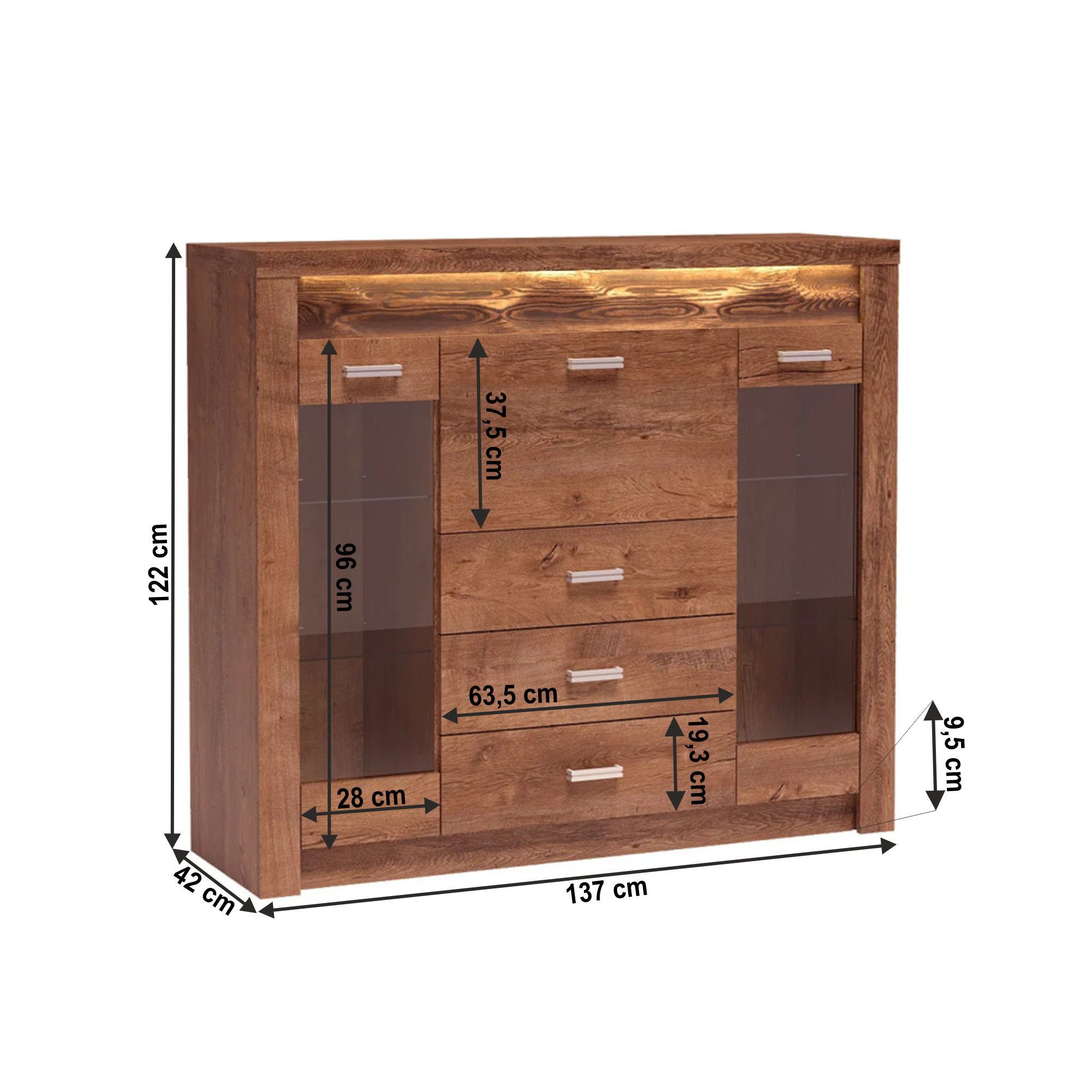 Komoda 10 z luxusního sektorového nábytku Korpus hrubý až 48 mm,Tloušťka materiálu zbývající části: 16 mm, úchytky kovové Materiál DTD laminovaná, ABS hrany, barevné provedení: jasan světlý, Rozměry ŠxHxV: 96x42x72,5 cm. Možnost dokoupení LED osvětlení v ceně 890 Kč. Dodávané v demontu. Hmotnost: 31.5kg