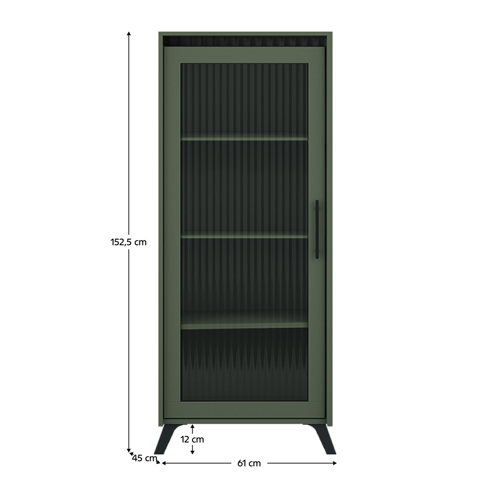 Materiál: laminovaná DTD/fóliovaná MDF/PVC fólie/sklo Barva: smoke zelená/černá Rozměry (ŠxHxV): 61x45x152,5 cm Tloušťka materiálu: 1,6-1,9 cm Jednodveřová Dvířka se sklem Tloušťka skla: 0,4 cm Leštěné sklo Kalené sklo Drážkované sklo Průhledné sklo Policová S úchytkou Materiál úchytky: kov Na nožičkách Barva nožiček: černá Výška nožiček: 12 cm Panty Hrana : papír impregnovaný termosetovými polymery/PVC Tloušťka materiálu ABS: 0,5 mm Tloušťka dřevovláknité desky zadní strana/dno zásuvky: 0,3 cm Barva zadní strana/dno zásuvky: tmavý dub milán Dekorativní frézování Moderní design Dodáváno v demontu