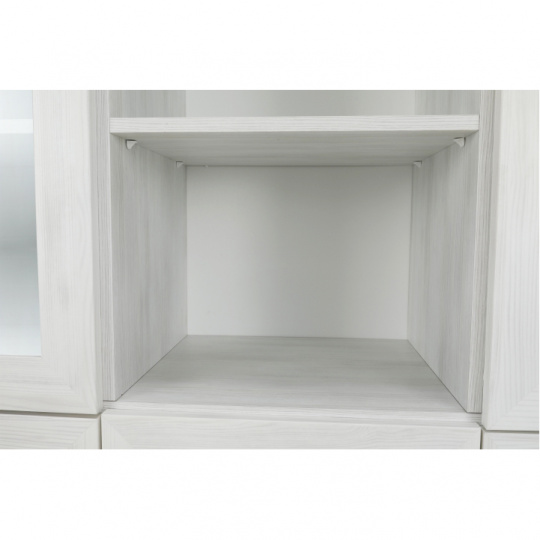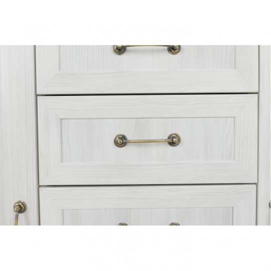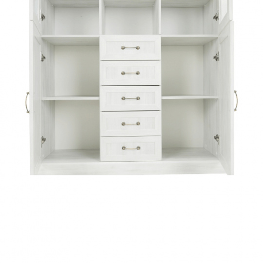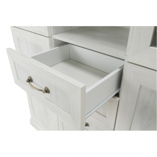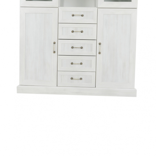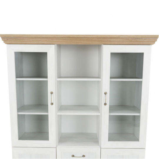 Vitrína W2D, čtyři skříní, pět šuplíků, otevřený úložný prostor s policemi z elegantního sektorového systému Royal v provensálském stylu. Vhodný na zařízení obývacích pokojů či ložnic. Materiál: korpus DTD laminovaná + ozdobné lišty, kovové úchytky Barevné provedení: sosna skandinávská v kombinaci s dubem divokým. Rozměry ŠxHxV: 127x39x187 cm Tloušťka materiálu korpus: 15 mm Tloušťka materiálu vrchní desky: 22 mm Dodávané v demontu .