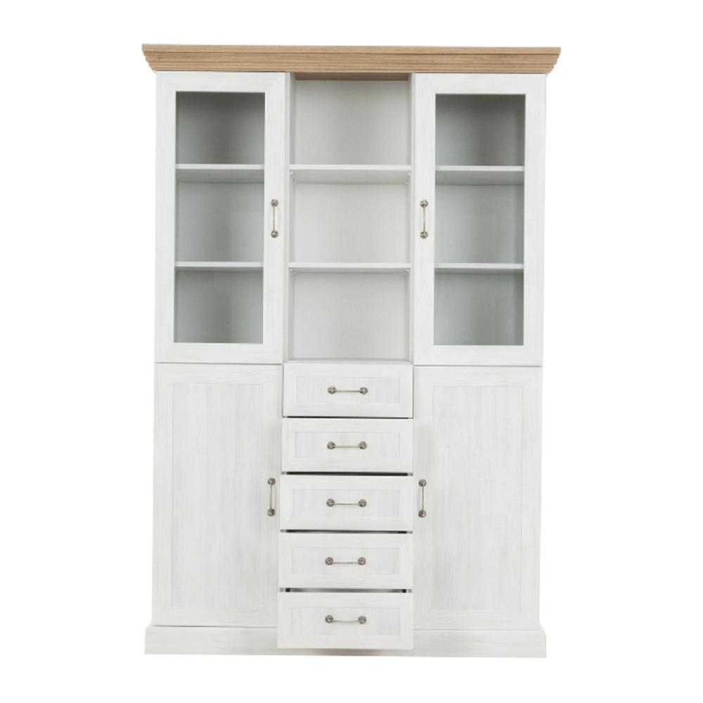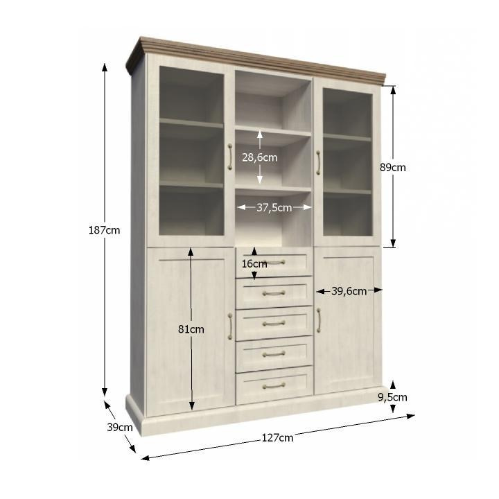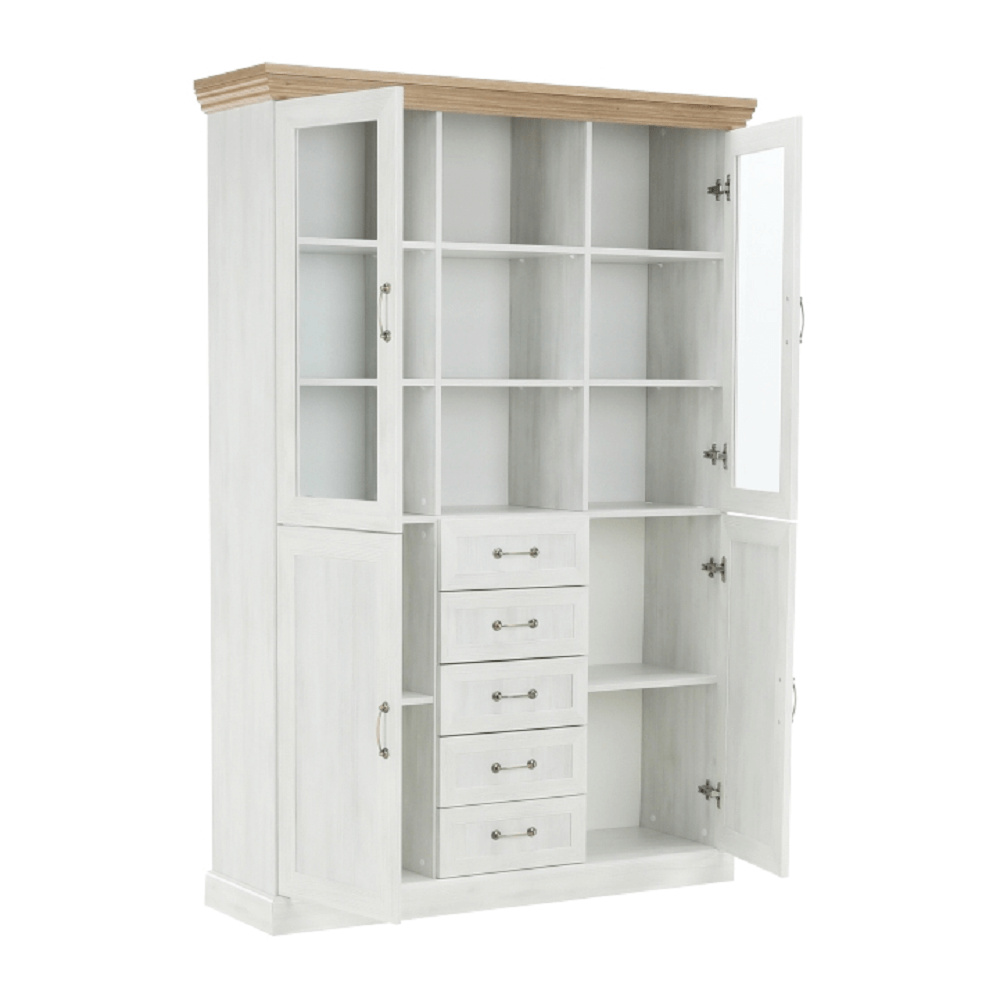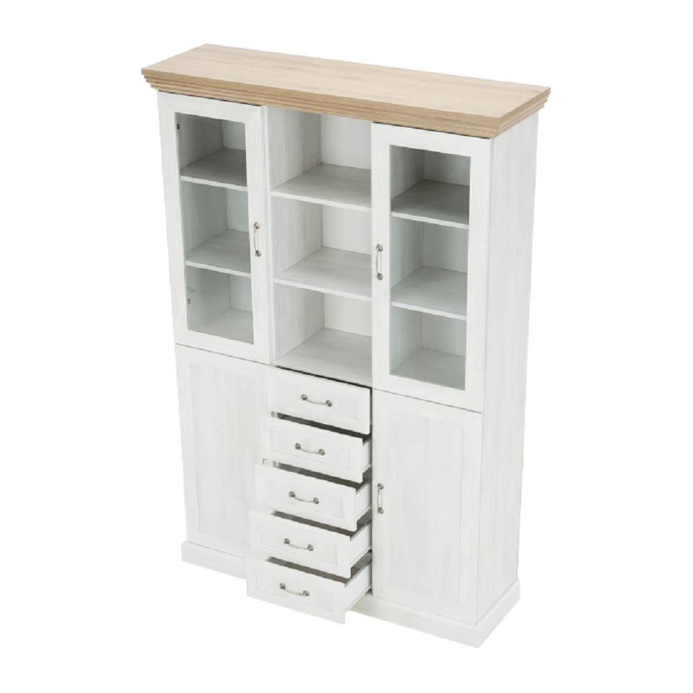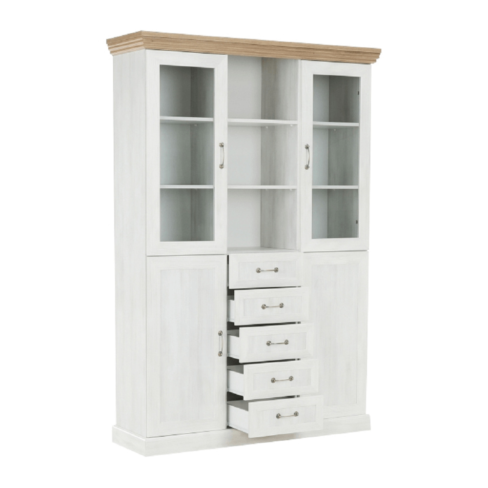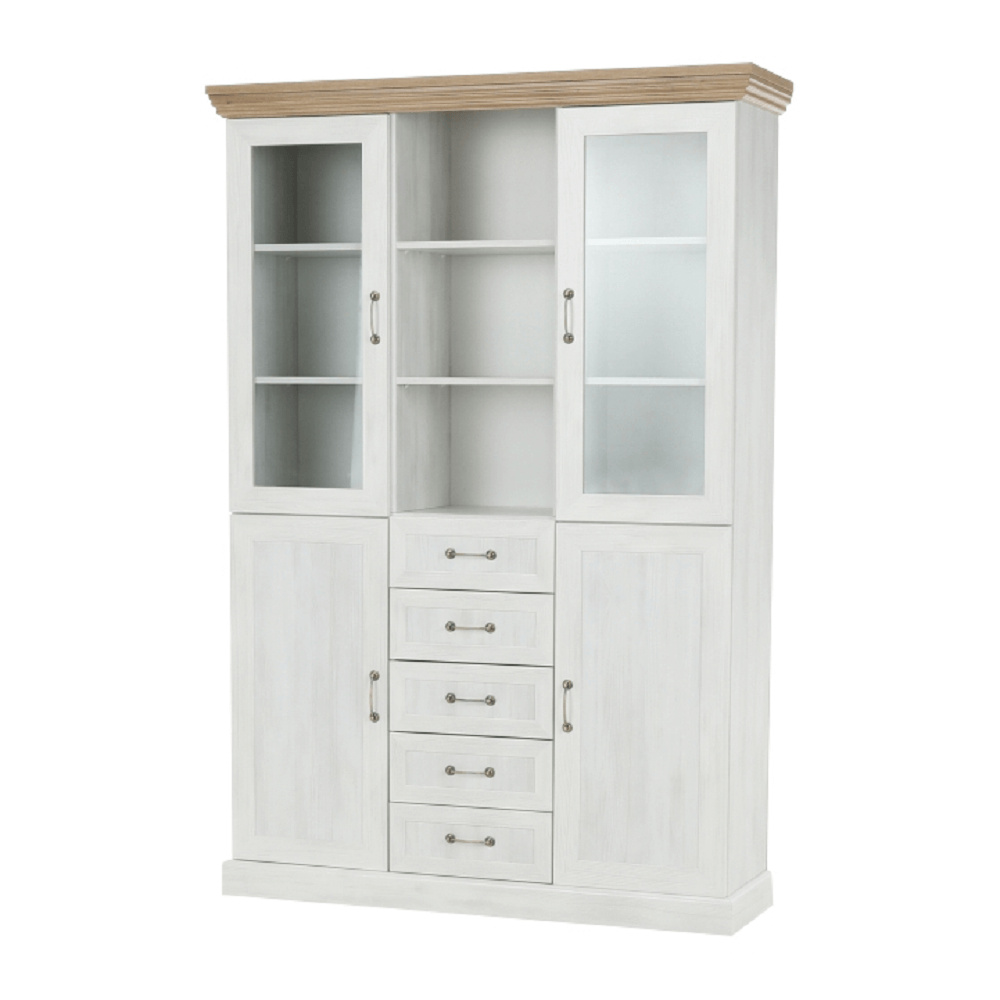 Vitrína W2D, čtyři skříní, pět šuplíků, otevřený úložný prostor s policemi z elegantního sektorového systému Royal v provensálském stylu. Vhodný na zařízení obývacích pokojů či ložnic. Materiál: korpus DTD laminovaná + ozdobné lišty, kovové úchytky Barevné provedení: sosna skandinávská v kombinaci s dubem divokým. Rozměry ŠxHxV: 127x39x187 cm Tloušťka materiálu korpus: 15 mm Tloušťka materiálu vrchní desky: 22 mm Dodávané v demontu .