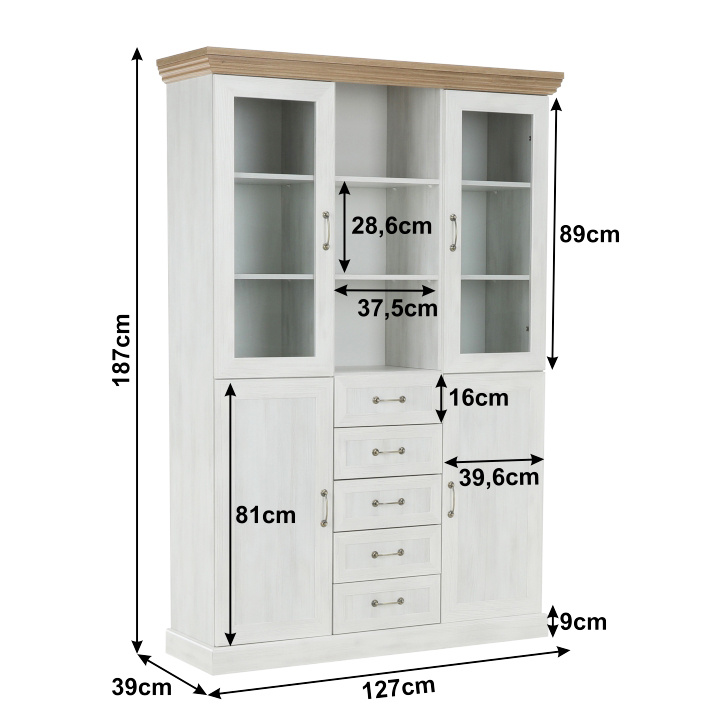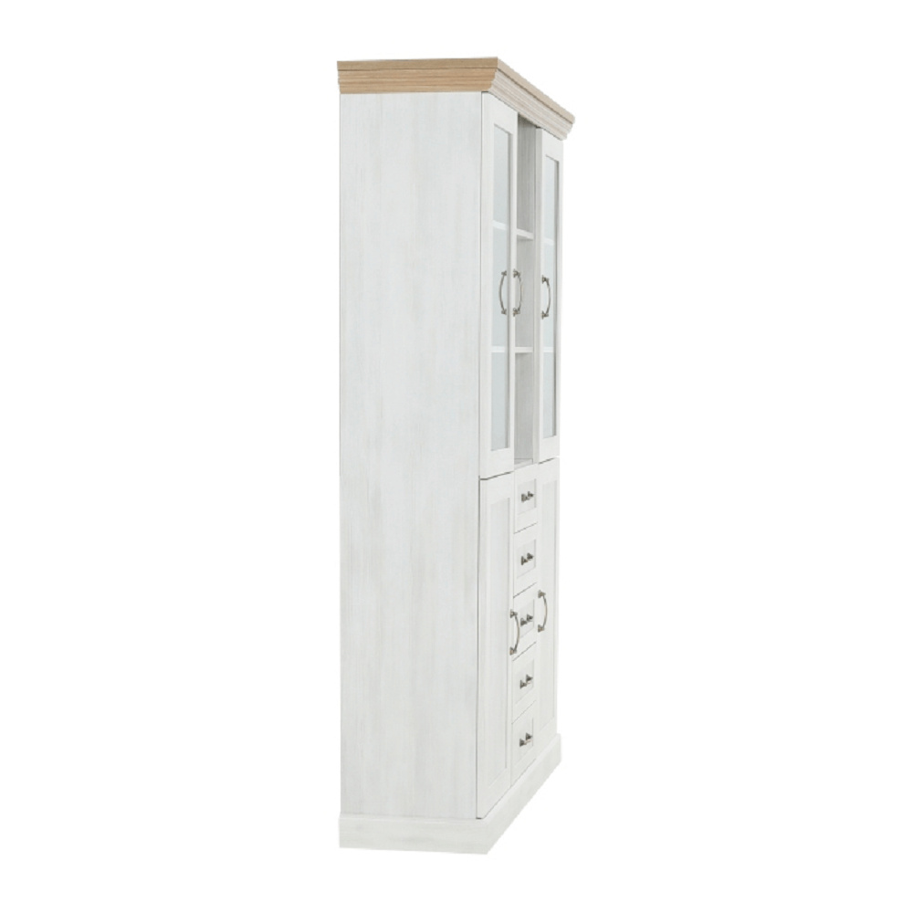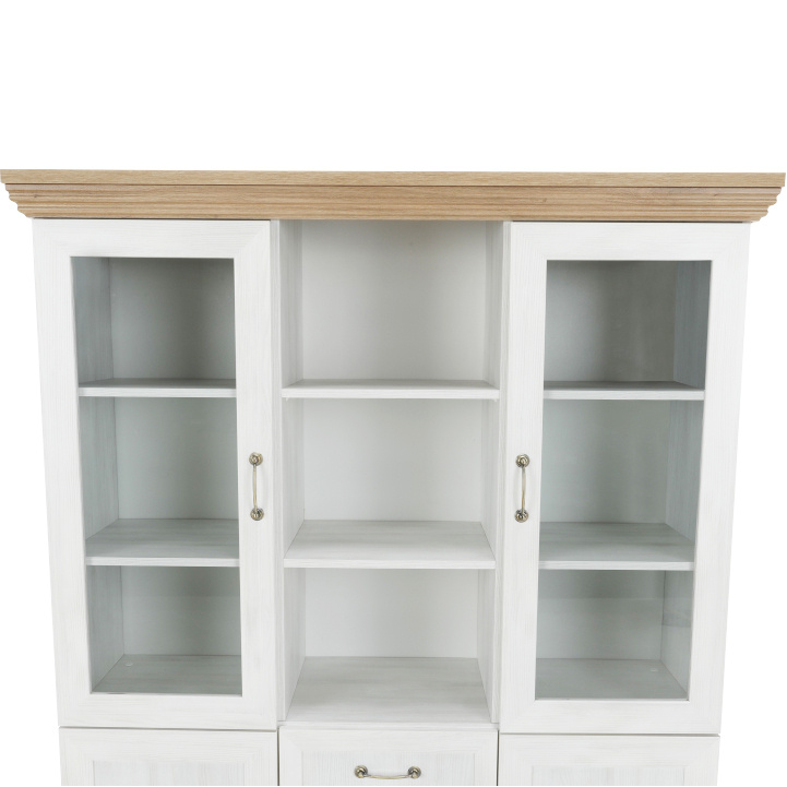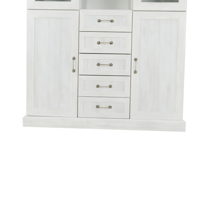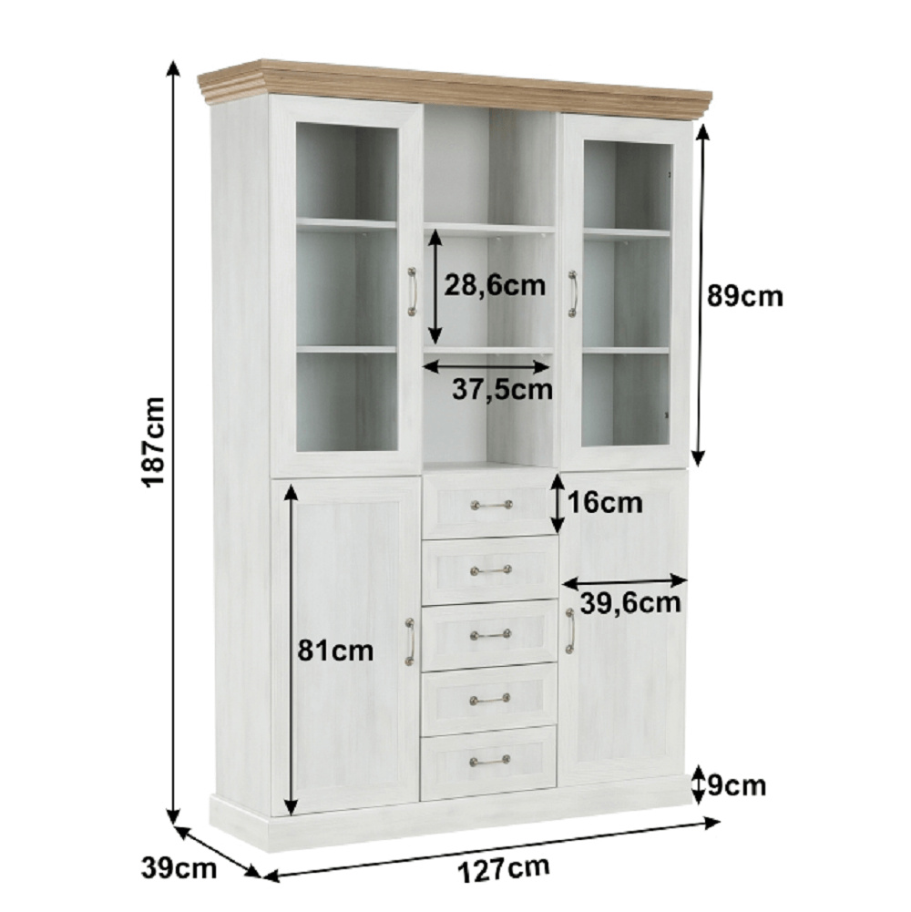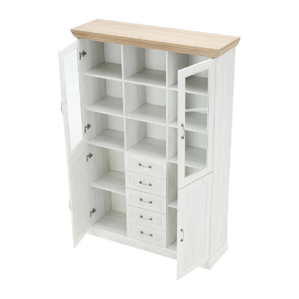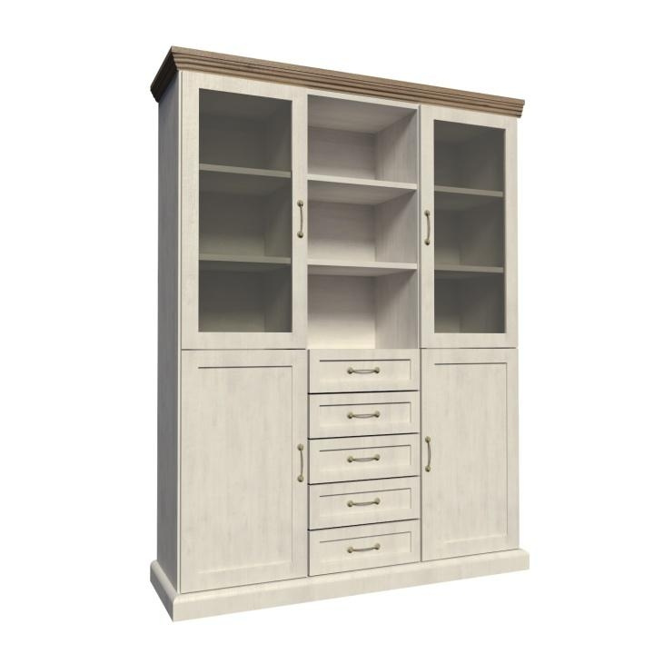 Vitrína W2D, čtyři skříní, pět šuplíků, otevřený úložný prostor s policemi z elegantního sektorového systému Royal v provensálském stylu. Vhodný na zařízení obývacích pokojů či ložnic. Materiál: korpus DTD laminovaná + ozdobné lišty, kovové úchytky Barevné provedení: sosna skandinávská v kombinaci s dubem divokým. Rozměry ŠxHxV: 127x39x187 cm Tloušťka materiálu korpus: 15 mm Tloušťka materiálu vrchní desky: 22 mm Dodávané v demontu .