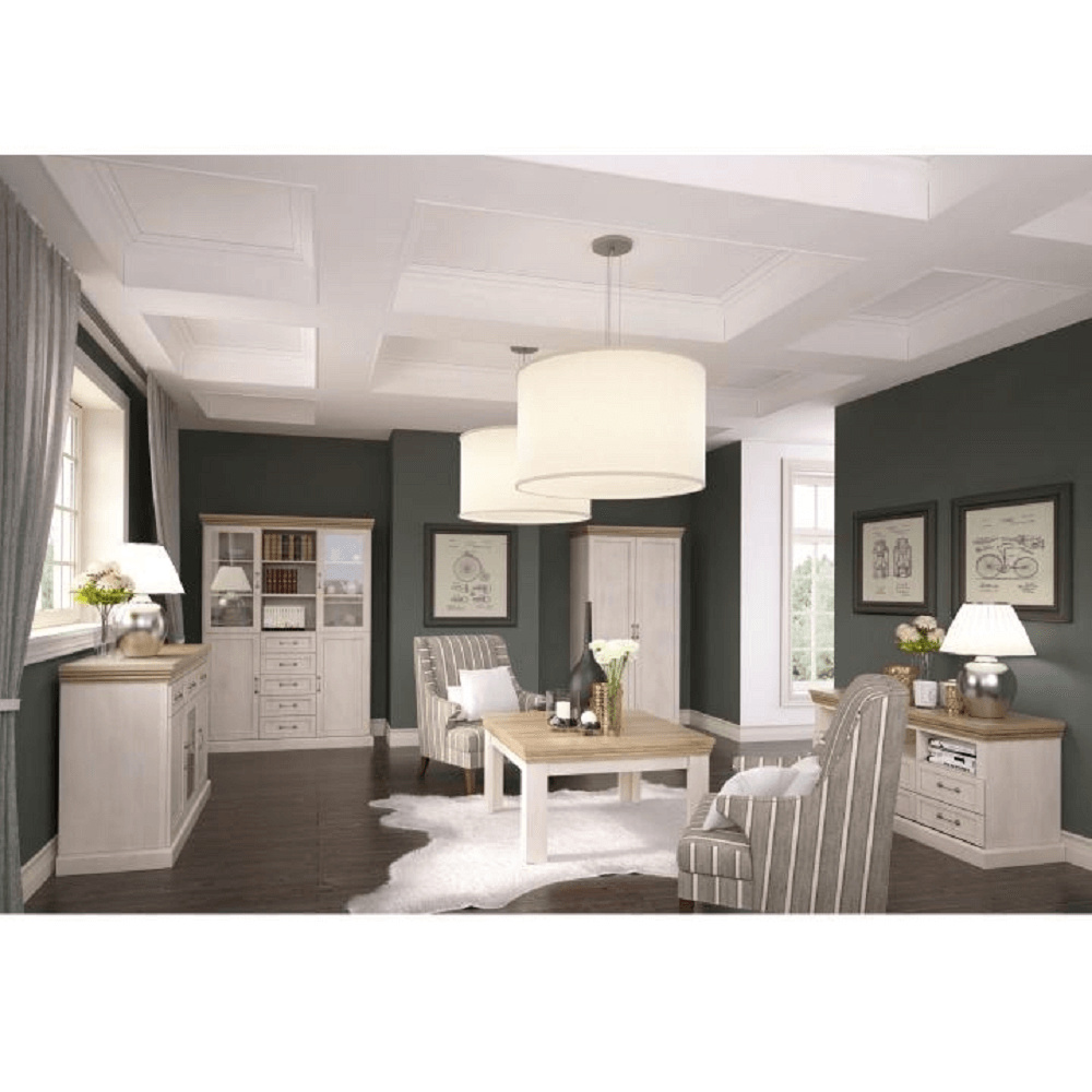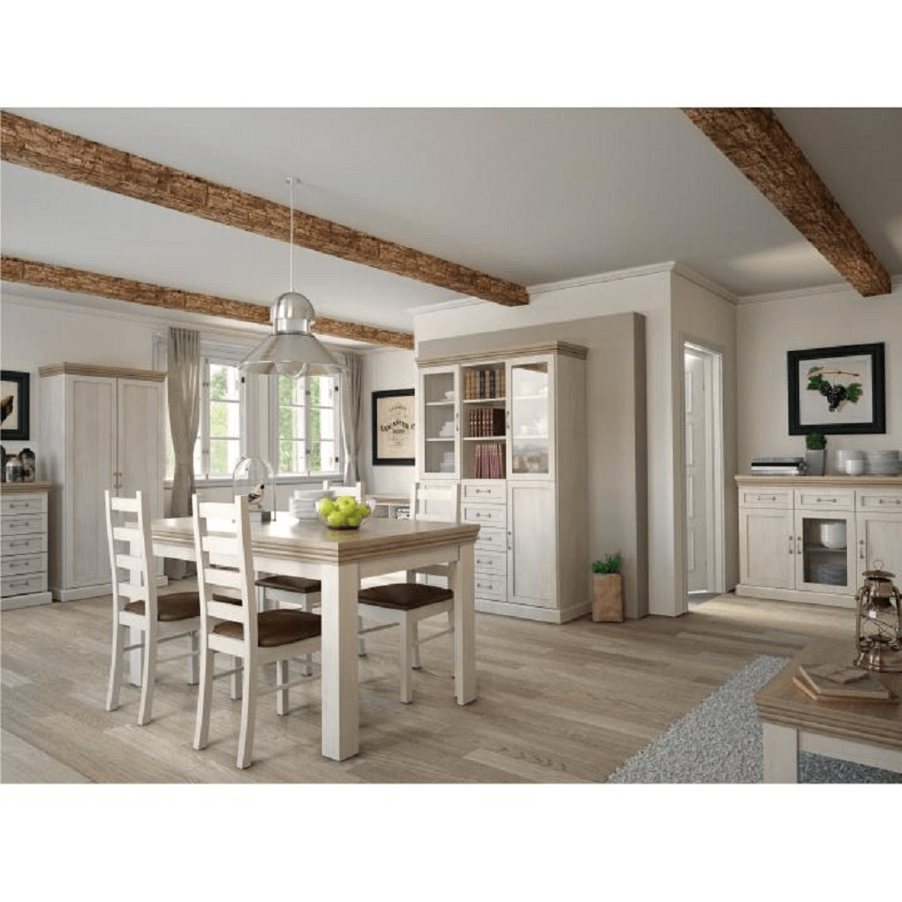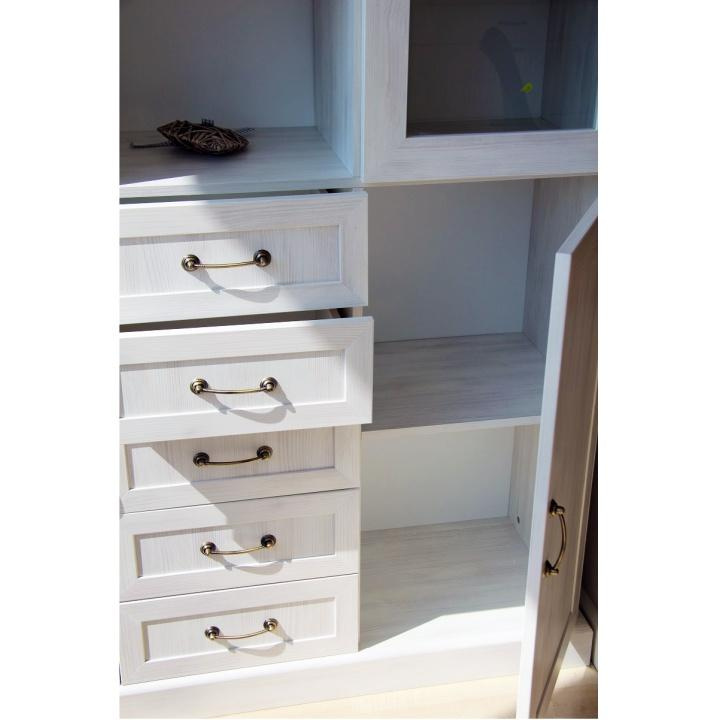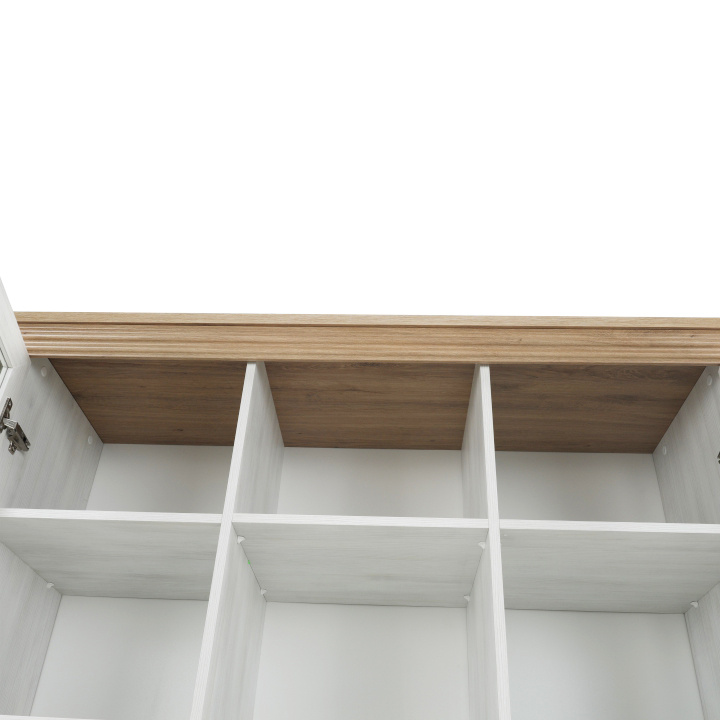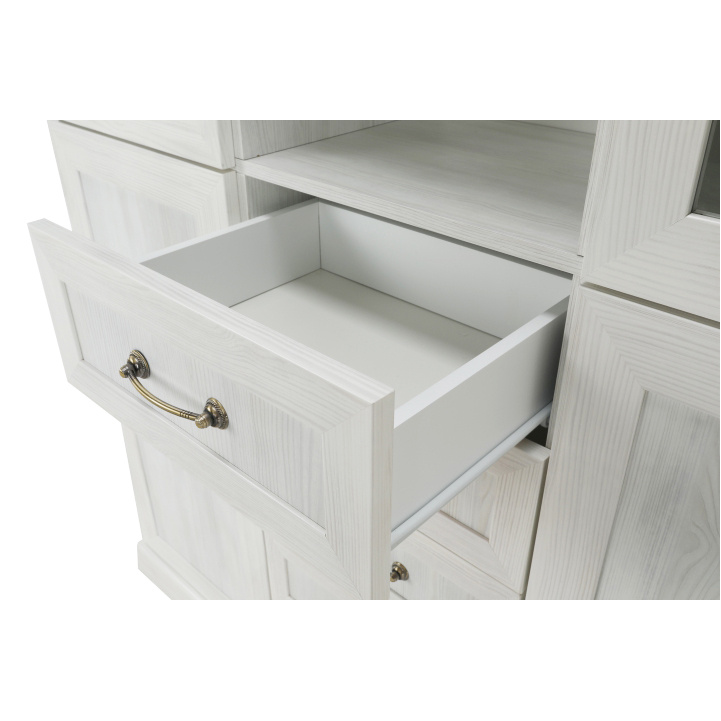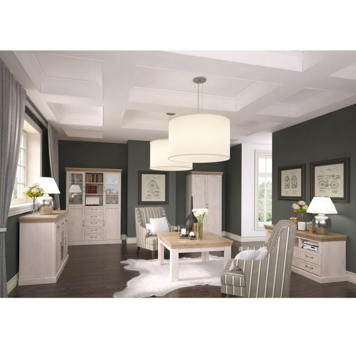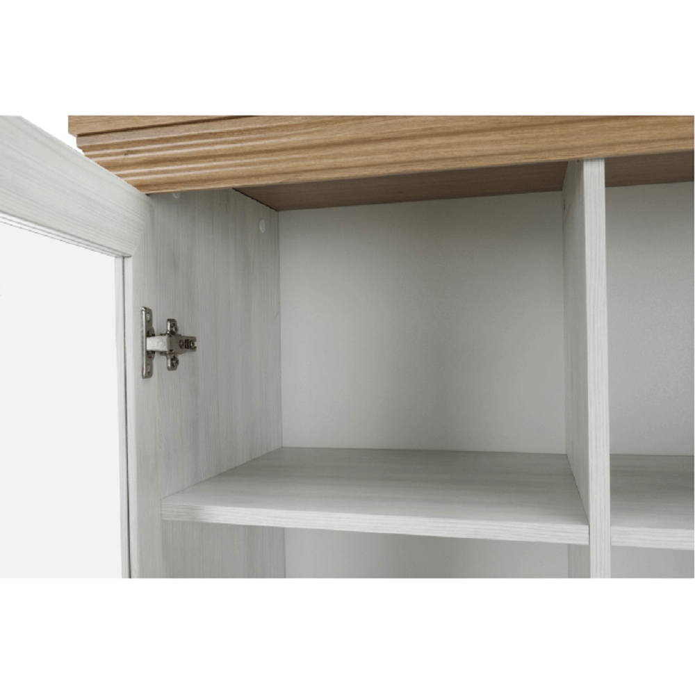 Vitrína W2D, čtyři skříní, pět šuplíků, otevřený úložný prostor s policemi z elegantního sektorového systému Royal v provensálském stylu. Vhodný na zařízení obývacích pokojů či ložnic. Materiál: korpus DTD laminovaná + ozdobné lišty, kovové úchytky Barevné provedení: sosna skandinávská v kombinaci s dubem divokým. Rozměry ŠxHxV: 127x39x187 cm Tloušťka materiálu korpus: 15 mm Tloušťka materiálu vrchní desky: 22 mm Dodávané v demontu .