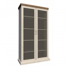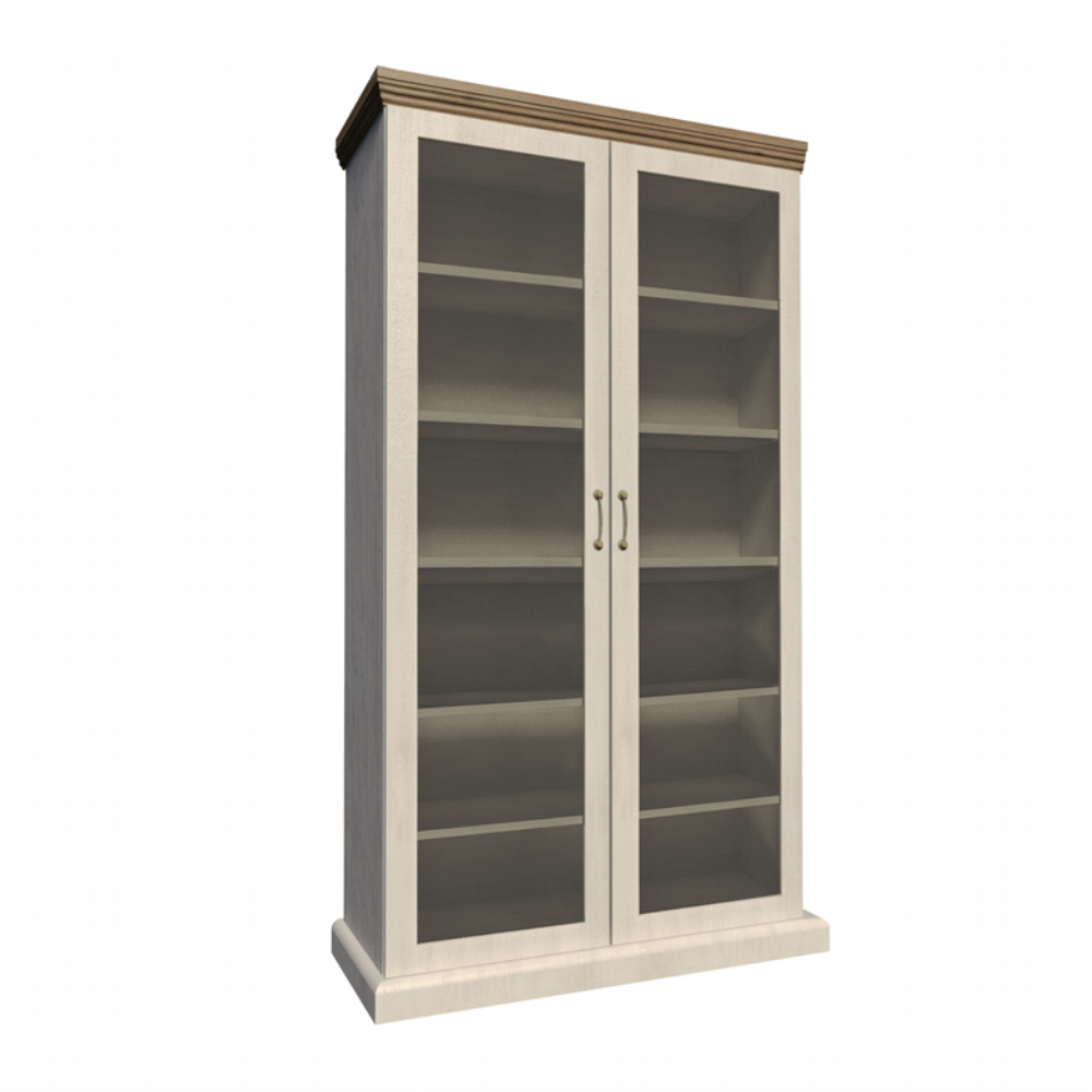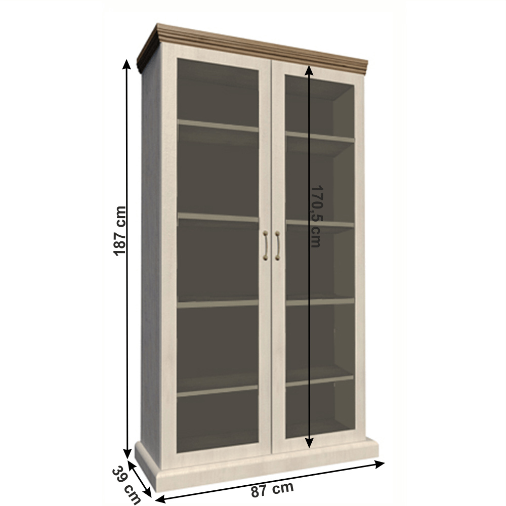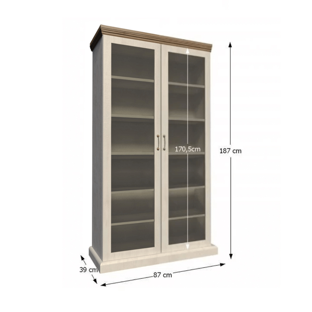 Vitrína WS, dvoudveřová s pěti policemi z elegantního sektorového systému Royal v provensálském stylu. Vhodná na zařízení obývacích pokojů či ložnic. Materiál: korpus DTD laminovaná + ozdobné lišty, kovové úchytky Barevné provedení: sosna skandinávská v kombinaci s dubem divokým. Rozměry ŠxHxV: 87x39x187 cm Tloušťka materiálu korpus: 15 mm Tloušťka materiálu vrchní desky: 22 mm Dodávané v demontu.
