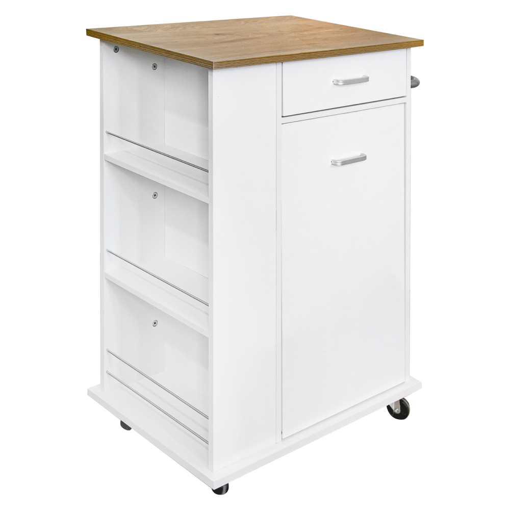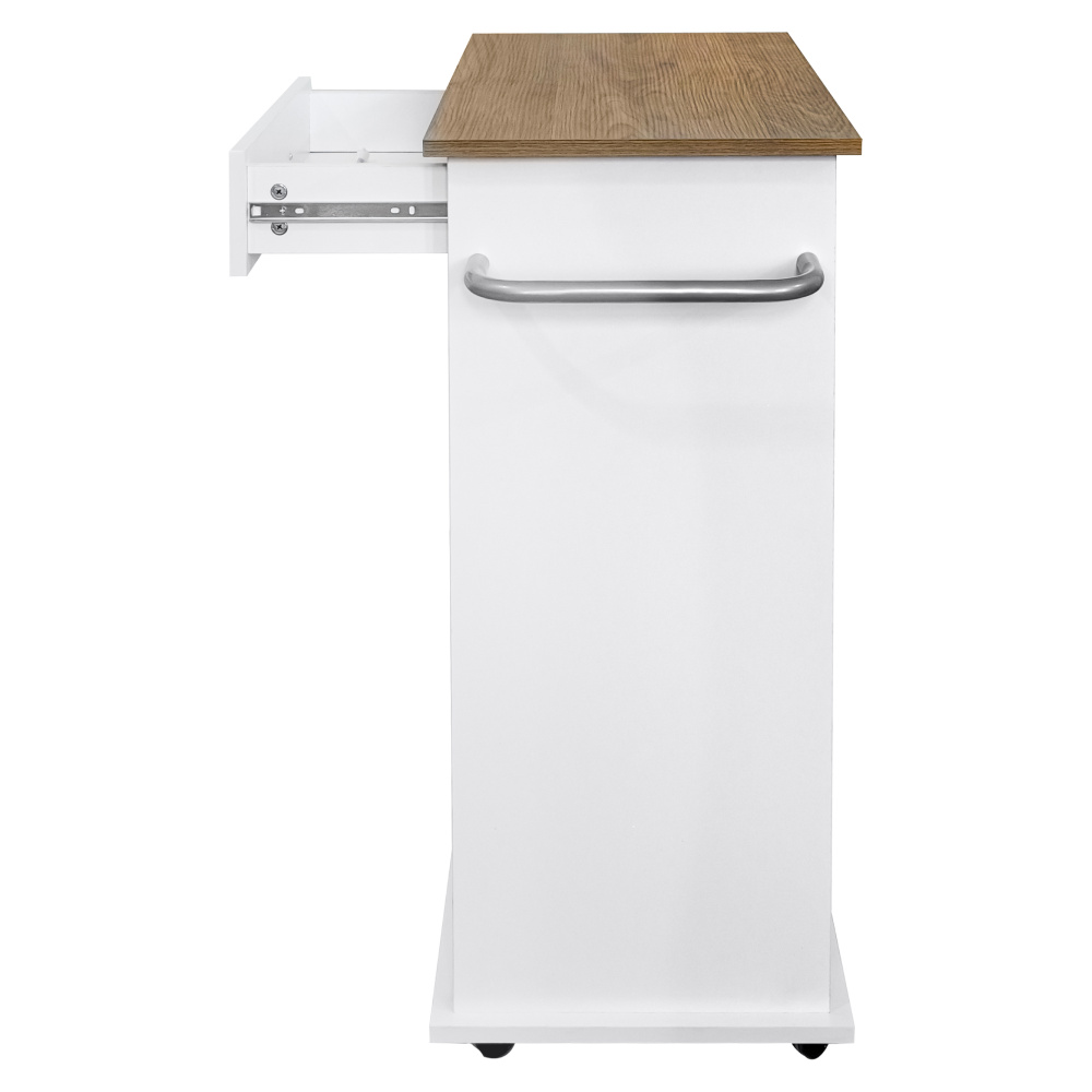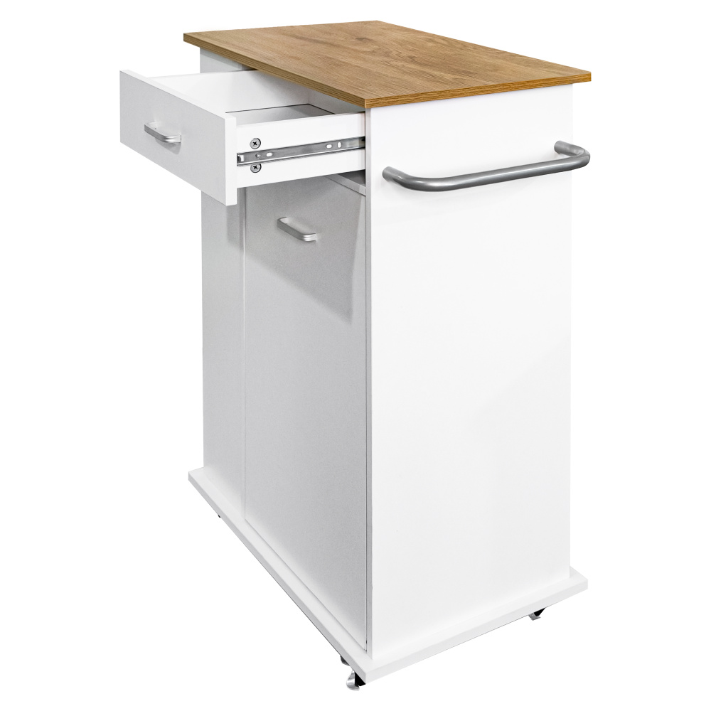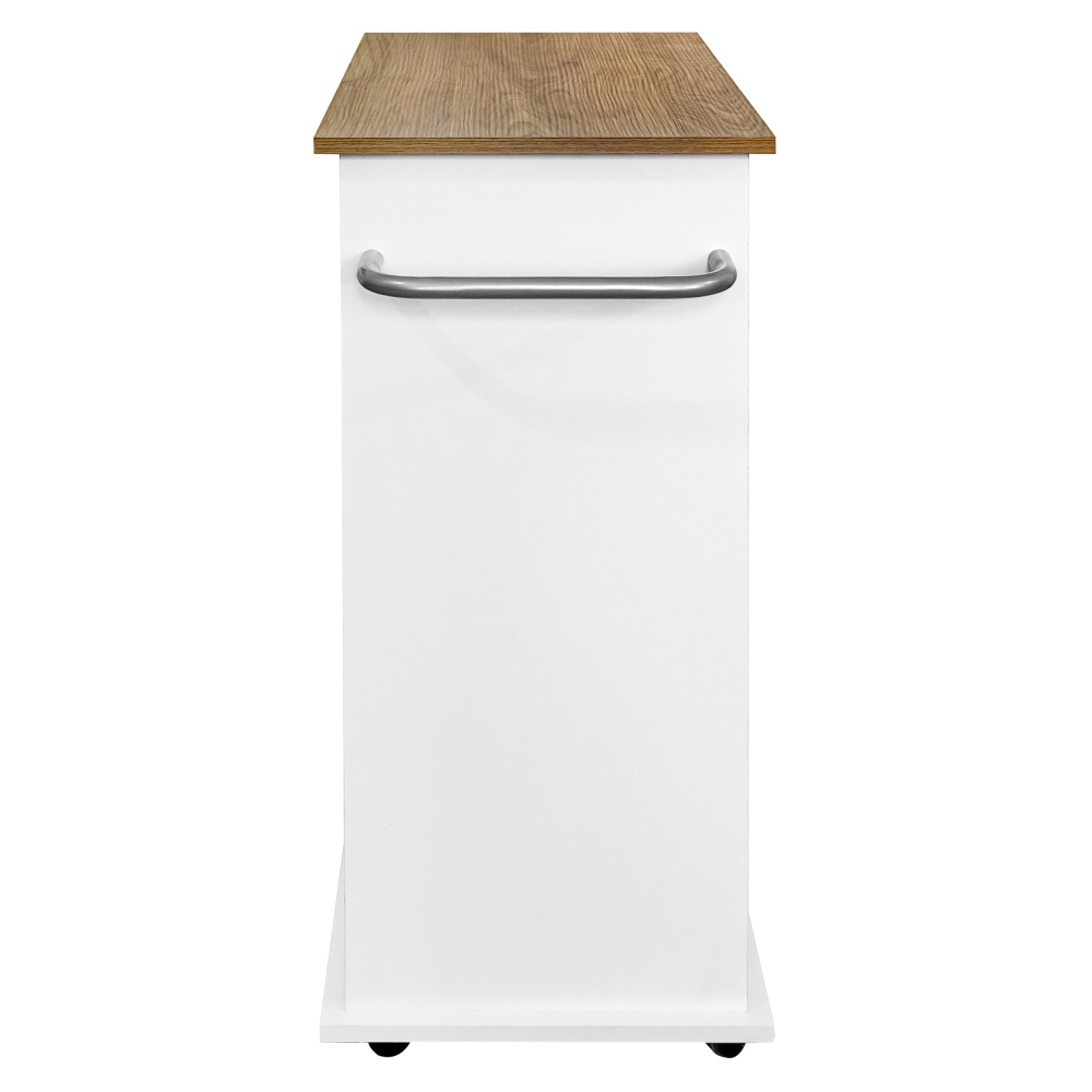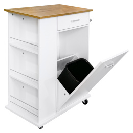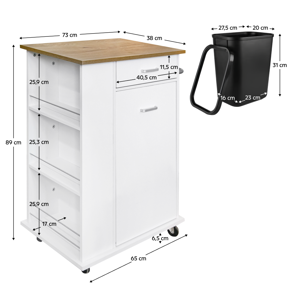 Materiál: MDF fóliovaná Barva: bílá/dub Rozměry (ŠxHxV): 73x38x89 cm Tloušťka materiálu: 1,2-1,5 cm Šuplík Rozměry šuplíku (ŠxV): 40,5x11,5 cm Vnitřní rozměry šuplíku (ŠxHxV): 36,5x28,7x6,6 cm 3 boční police Zábrany na poličkách Kovový držák Výklopná dvířka Dodáváno s odpadkovým košem Odnímatelný odpadkový koš Rozměry koše (ŠxHxV): 27,5x20x31 cm Objem koše: 14 l Kroužek pro uchycení sáčku Na kolečkách Kolečka s brzdami Výška koleček: 6,5 cm Stříbrné úchytky Materiál úchytky: kov Ideální do kuchyně, kanceláře nebo technické místnosti. Víceúčelová Nosnost: 20 kg Dodáváno v demontu