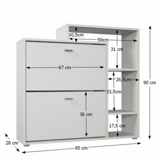 Materiál: MDF / dřevotříska Barva: šedá / bílá Rozměry (ŠxHxV): 53,5x24x117 cm 3-řadový Nosnost: 75 kg Vhodný na 12 párů bot výklopné šuplíky S úchytkami Dodávané v demontu Hmotnost: 19.5kg