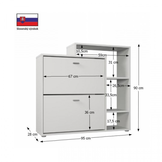 Výklopný dvouřadý botník IZABELA Materiálové provedení: DTD laminovaná Barevné provedení: bílá Rozměry ŠxHxV: 95x28x90 cm Tloušťka materiálu: 16 mm Dodávané v demontu.