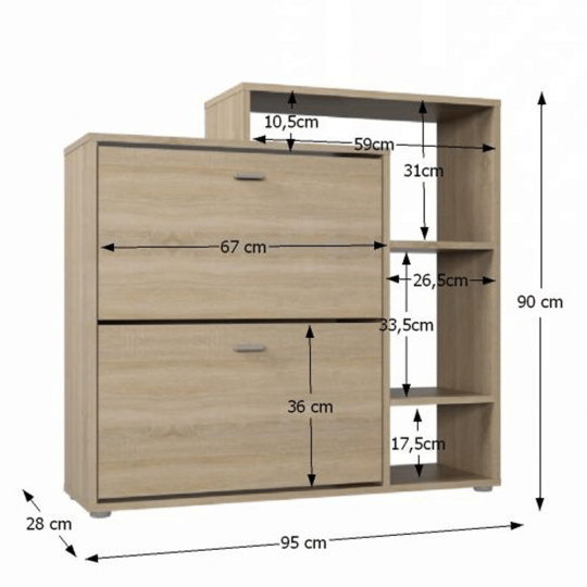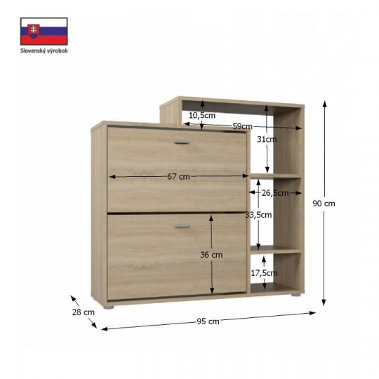 Výklopný dvouřadý botník IZABELA Materiálové provedení: DTD laminovaná Barevné provedení: dub sonoma Rozměry ŠxHxV: 95x28x90 cm Tloušťka materiálu: 16 mm Dodávané v demontu.