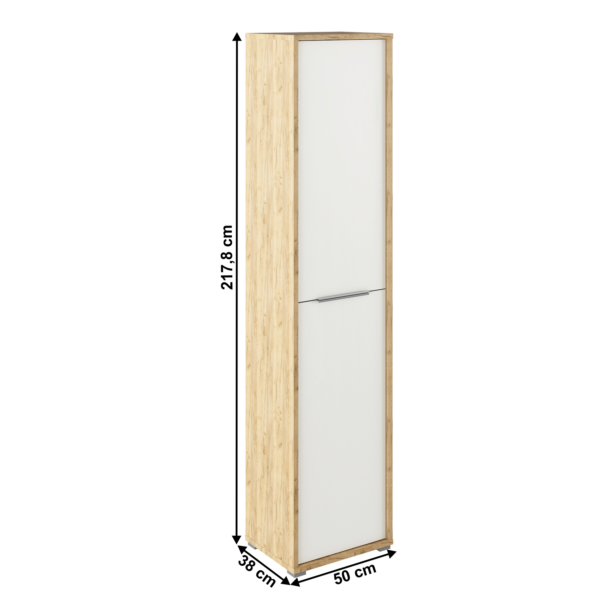 Vysoká policová skříň RIOMA TYP 06 Barevné provedení: dub artisan/bílá Materiál: DTD laminovaná Rozměry (ŠxHxV): 50x38x217,8 cm Tloušťka materiálu: 16/22 mm Dodávané v demontu