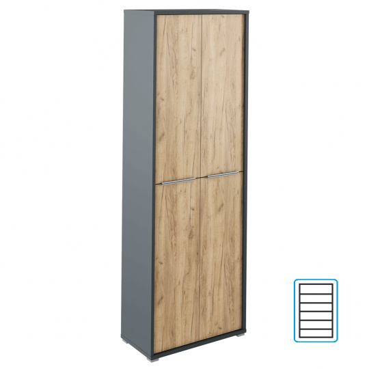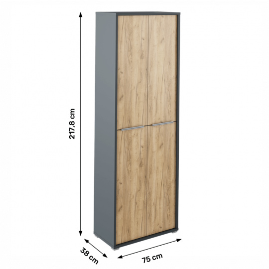 Vysoká skříň RIOMA NEW TYP 5 Barevné provedení: grafit / dub artisan Materiál: DTD laminovaná Rozměry (ŠxHxV): 75x38x217,8 cm Tloušťka materiálu: 16/22 mm policová Dodávané v demontu.