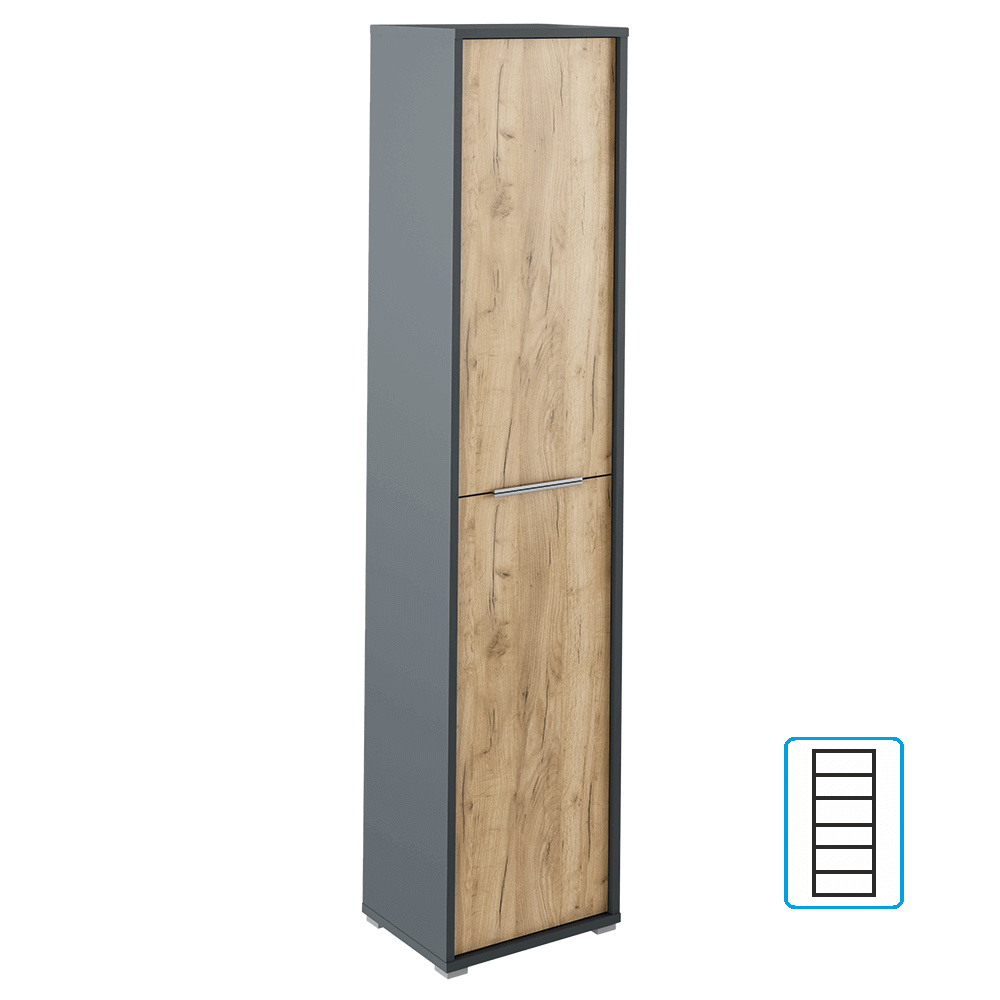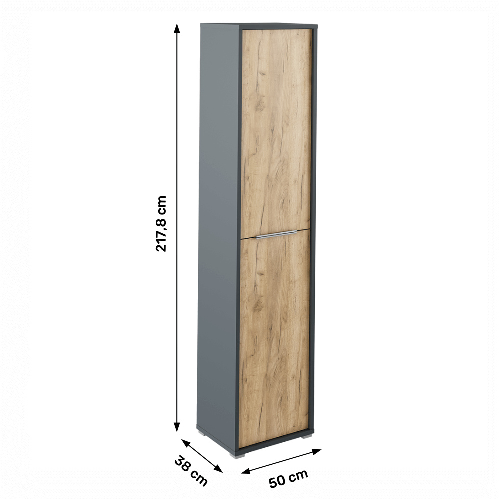Vysoká skříň RIOMA NEW TYP 6 Barevné provedení: grafit / dub artisan Materiál: DTD laminovaná Rozměry (ŠxHxV): 50x38x217,8 cm Tloušťka materiálu: 16/22 mm policová Dodávané v demontu.