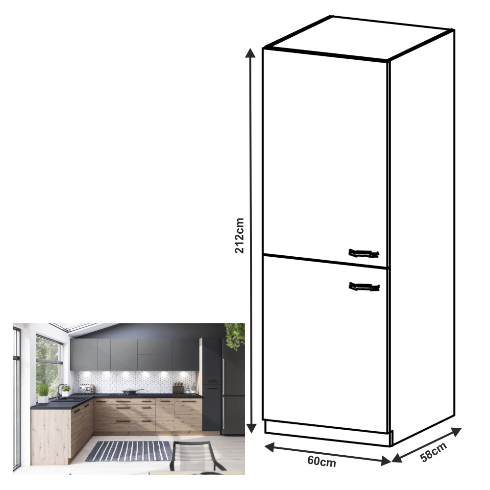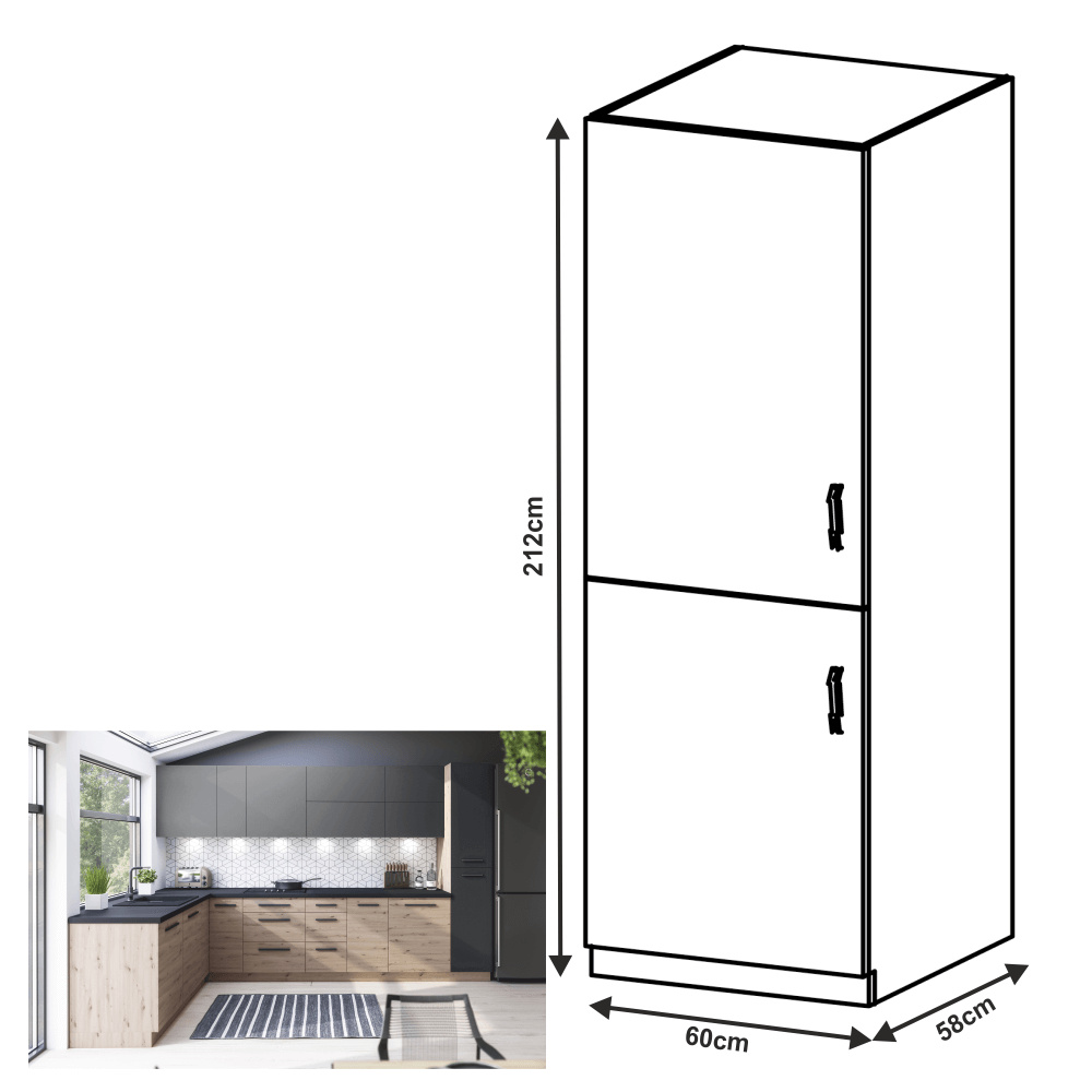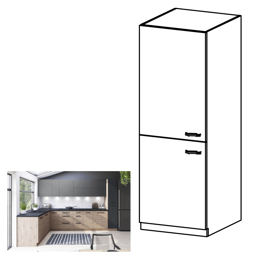 Materiál: DTD laminovaná Barva: dub artisan Rozměry (ŠxHxV): 60x58x212 cm Skříň na vestavnou lednici Tloušťka materiálu dvířka (dub artisan): 1,5 cm Tloušťka materiálu dvířka (šedá MDF): 1,8 cm Unierzální provedení Možnost volby otevírání PUSH OPEN Možnost volby otevírání úchytkami Bez spodní lišty Dodáváno v demontu Cena sektorových skříněk je uváděna bez pracovní desky a spodní lišty. Cena za pracovní desku dub artisan je 1.690 Kč / bm - tloušťka 38 mm, cena za pracovní desku černý vulkán je 1.990 Kč / bm - tloušťka 38 mm. Možnost dokoupení spodní lišty dub artisan v rozměru 1 m za cenu 280 Kč nebo v rozměru 2 m za cenu 560 Kč a ukončení na sokl o hloubce 47 cm nebo 58 cm za 140 Kč. Ke každé dolní skříňce je nutné doobjednat 2 ks úchytů na sokl cena 40 Kč / 2 ks. U skříněk D60S3 a D40S3 je třeba si vybrat skříňku s úchytkou nebo systémem Push Open.