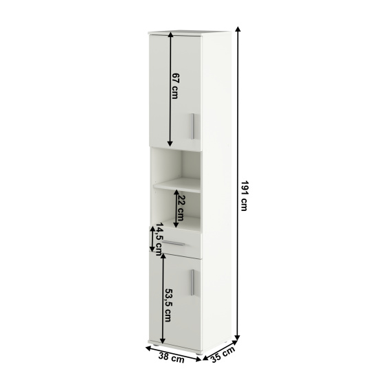 Materiál: DTD laminovaná Barva: matná bílá Rozměry (ŠxHxV): 38x35x191 cm Tloušťka materiálu: 1,6 cm Plastové úchytky Barva úchytek: šedá Plastové kluzáky Barva kluzáků: šedá Výška kluzáků: 1,6 cm 2dveřová Policová Otevřený úložný prostor 1 šuplík Univerzální Moderní design Dodáváno v demontu Kvalitní slovenský výrobek