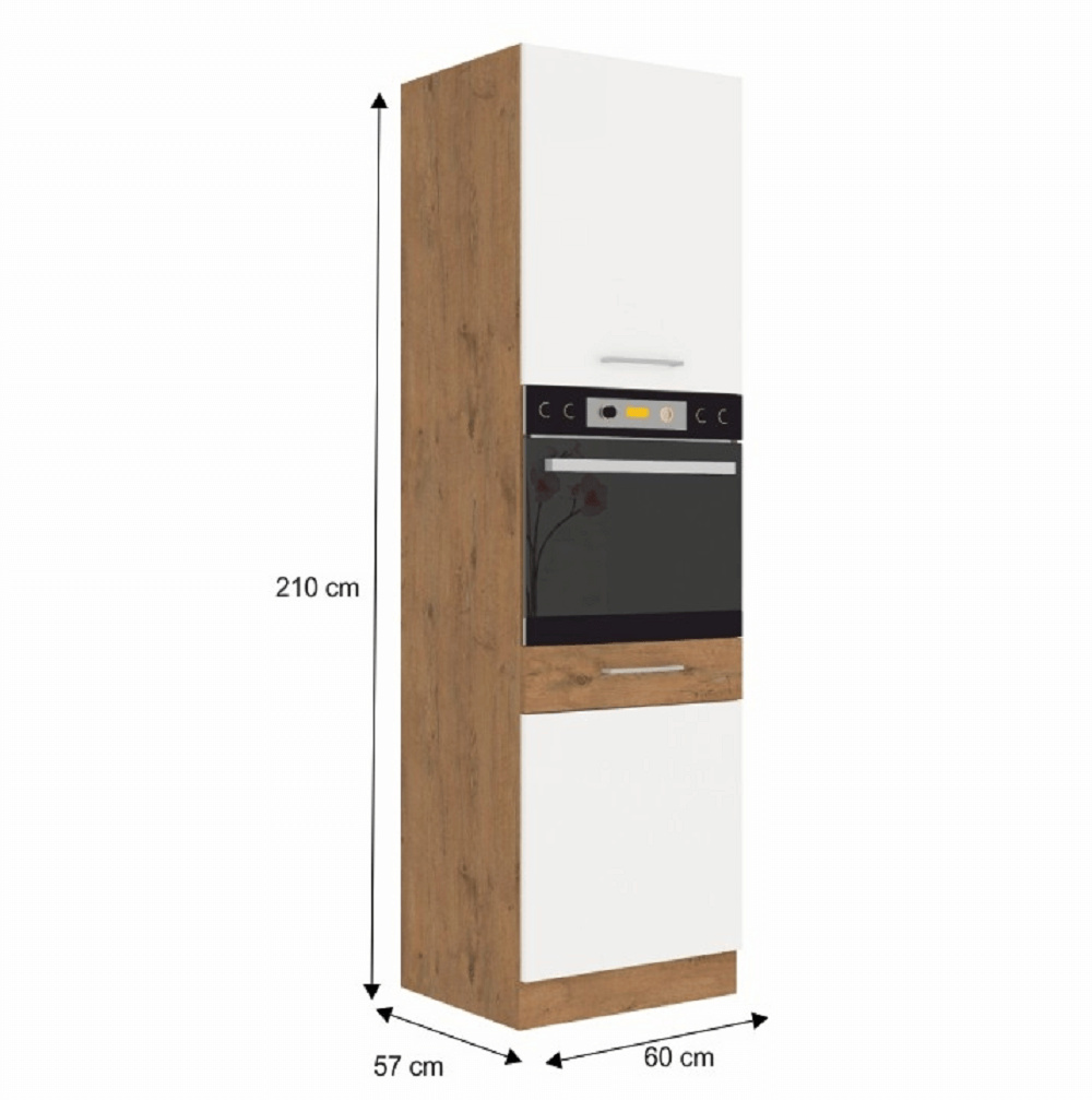 Vysoká skříňka na vestavnou troubu VEGA 60 DP-210 2F Materiál: DTD laminovaná Barva: dub lancelot / bílá extra vysoký lesk HG Rozměry (ŠxHxV): 60x57X210 cm Dodávané v demontu Spodní skříňky jsou dodávány včetně dolní lišty, bez pracovní desky. Možnost dokoupit pracovní desku dub lancelot v ceně: 1590 Kč/bm. Možnost dokoupit univerzální L / P dřez LAY ON.