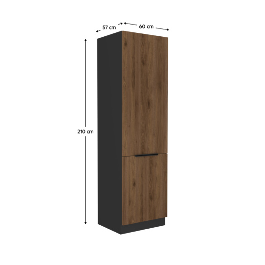 Materiál: laminovaná DTD Barva dvířek: ořech okapi Barva korpusu: černý mat Rozměry (ŠxHxV): 60x57x210 cm Tloušťka materiálu: 1,6 cm S dvířky S úchytkami Barva úchytky: aluminiová Policová Potravinová S dolní lištou/soklem Bez pracovní desky Systém tichého zavírání dvířek Moderní design Dodáváno v demontu Spodní sektorové skříňky jsou dodávány včetně dolní lišty (sokla), bez pracovní desky. Pracovní desku o tloušťce 3,8 cm si můžete doobjednat v provedení marmur roma za cenu 1.650 Kč/bm.