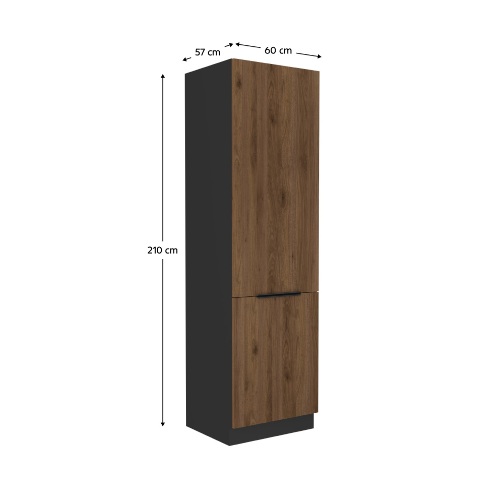 Materiál: laminovaná DTD Barva dvířek: ořech okapi Barva korpusu: černý mat Rozměry (ŠxHxV): 60x57x210 cm Tloušťka materiálu: 1,6 cm S dvířky S úchytkami Barva úchytky: aluminiová Policová Potravinová S dolní lištou/soklem Bez pracovní desky Systém tichého zavírání dvířek Moderní design Dodáváno v demontu Spodní sektorové skříňky jsou dodávány včetně dolní lišty (sokla), bez pracovní desky. Pracovní desku o tloušťce 3,8 cm si můžete doobjednat v provedení marmur roma za cenu 1.650 Kč/bm.