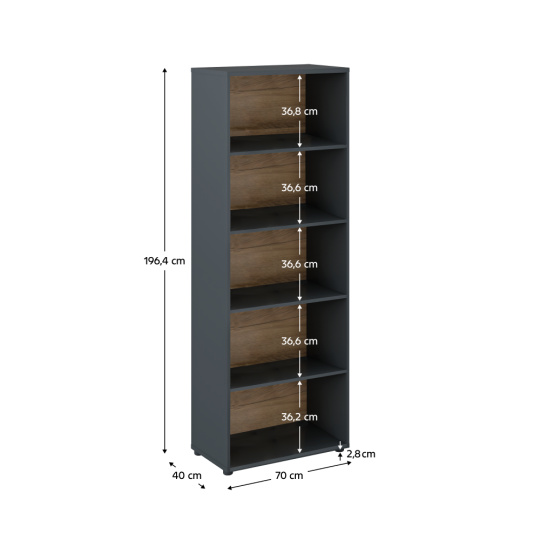 Materiál: DTD laminovaná Barva: garfit/dub artisan Rozměry (ŠxHxV): 70x40x196,40 cm Tloušťka materiálu: 1,6-2,2 cm Otevřený úložný prostor Čtyři police Nosnost police: 5 kg Na nožičkách Výškově nastavitelné nožičky Materiál nožiček: kov Barva nožiček: grafit Výška nožiček: 2,8-4,3 cm Kvalitní slovenský výrobek Dodáváno v demontu