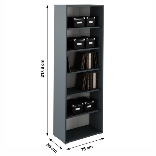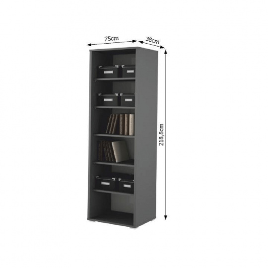 Vysoký regál Rioma NEW TYP 01 Barevné provedení: grafit Materiál: DTD laminovaná Rozměry (ŠxHxV): 75x38x217,8 cm Tloušťka materiálu: 22 mm Dodávané v demontu.