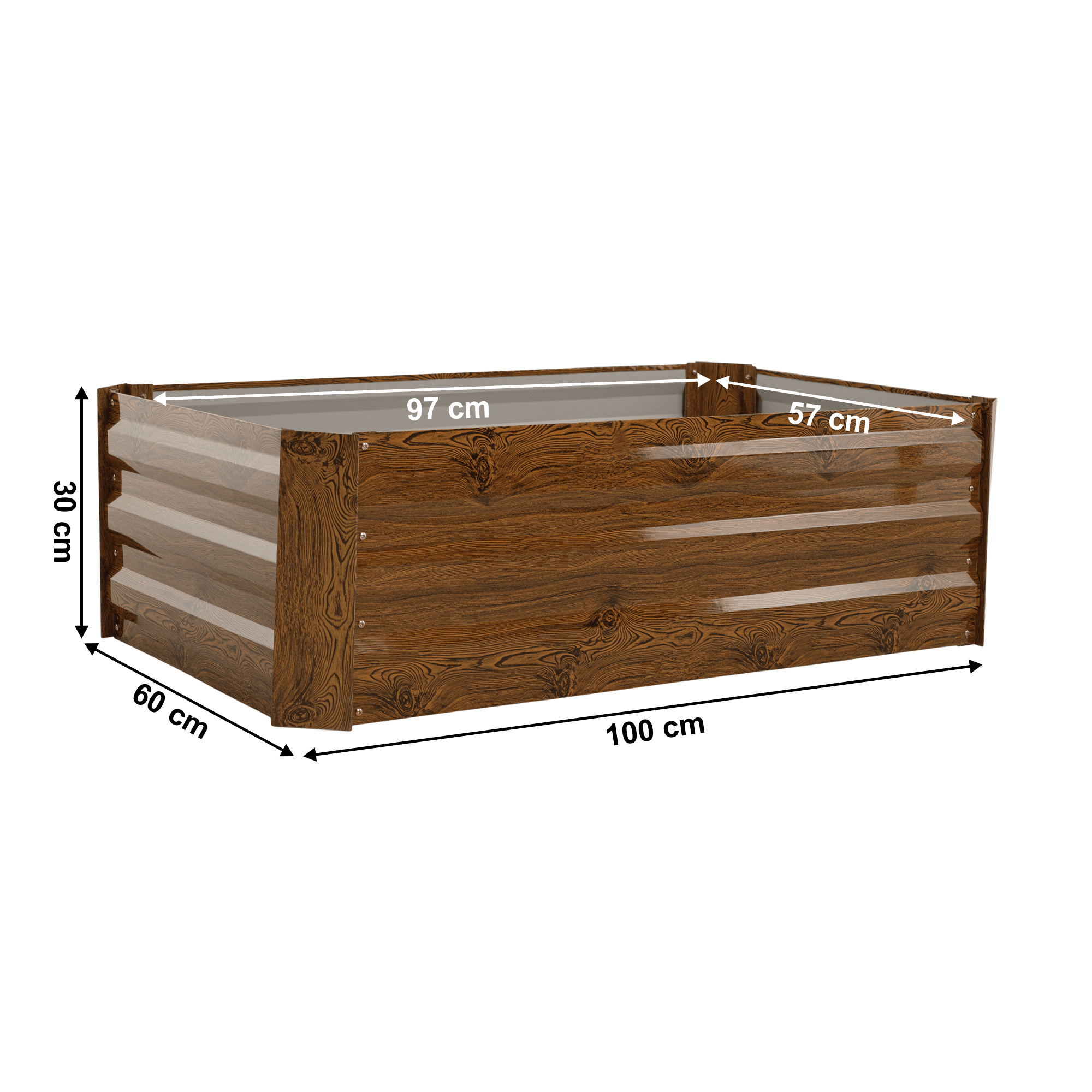 Materiál záhon: ocel/hliník Barva: hnědá/vzor dřevo Vnější rozměry (ŠxHxV): 100x60x30 cm Vnitřní rozměry(ŠxHxV): 97x57x30 cm Tloušťka materiálu: 0,3 mm, roh 0,8 mm Vhodný do interiéru i exteriéru Dodáván bez dna/podlahy Jednoduchá montáž Ocel s povrchovou práškovou úpravou Na bylinky, květiny nebo zeleninu Pro rostliny s rozdílnými nároky na pěstování Vyšší ochrana před hlemýždi Nízká náchylnost k růstu plevelů Ideální do míst s půdou chudou na živiny Vhodný i pro nejmenší zahrady Moderní design Všestranné využití Vhodný jako dárek Dodáván v demontu