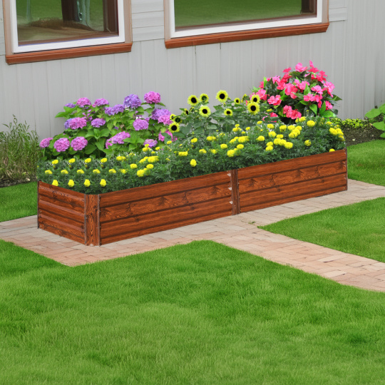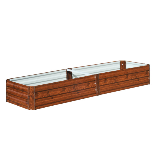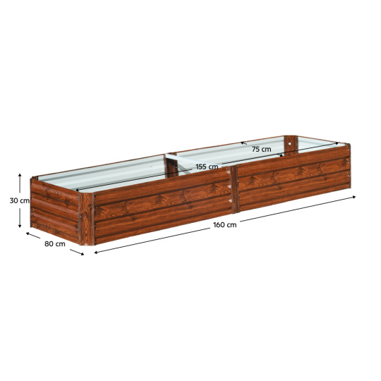 Materiál záhon: ocel/hliník Barva: hnědá/vzor dřevo Vnější rozměry (ŠxHxV): 160x80x30 cm Vnitřní rozměry(ŠxHxV): 155x75x30 cm Tloušťka materiálu: 0,3 mm, roh 0,8 mm Vhodný do interiéru i exteriéru Dodáván bez dna/podlahy Jednoduchá montáž Ocel s povrchovou práškovou úpravou Na bylinky, květiny nebo zeleninu Pro rostliny s rozdílnými nároky na pěstování Vyšší ochrana před hlemýždi Nízká náchylnost k růstu plevelů Ideální do míst s půdou chudou na živiny Vhodný i pro nejmenší zahrady Moderní design Všestranné využití Vhodný jako dárek Dodáván v demontu