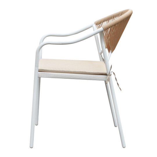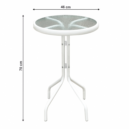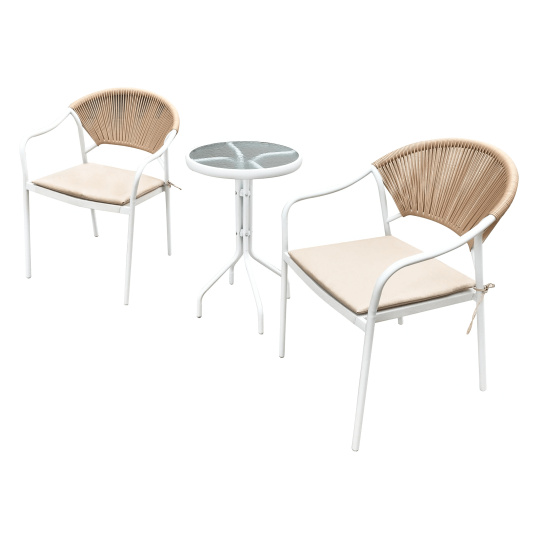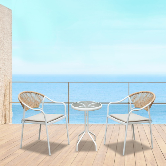 Materiál konstrukce: ocel Barva: bílá Materiál výplet: technický ratan Barva: béžová Materiál polštáře: voděodolná látka Barva: béžová Materiál deska stolu: tvrzené sklo Oděruodolnost textilie podle testu Martindale: 95 000 oděrů Rozměry stolu (průměr x V): 46x71,5 cm Nosnost stolu: 20 kg Rozměry židle (ŠxHxV): 56x60x85 cm Výška sedu: 46/43,5 cm Hloubka sedu: 46 cm Výška od země po opěrku na ruku: 66,5 cm Nosnost židle: 90kg S polštáři Rozměry polštářů (ŠxV): 46x41cm Tloušťka polštáře: 2,5 cm 3-dílná souprava Jeden stůl Dvě židle Dodáváno v monte