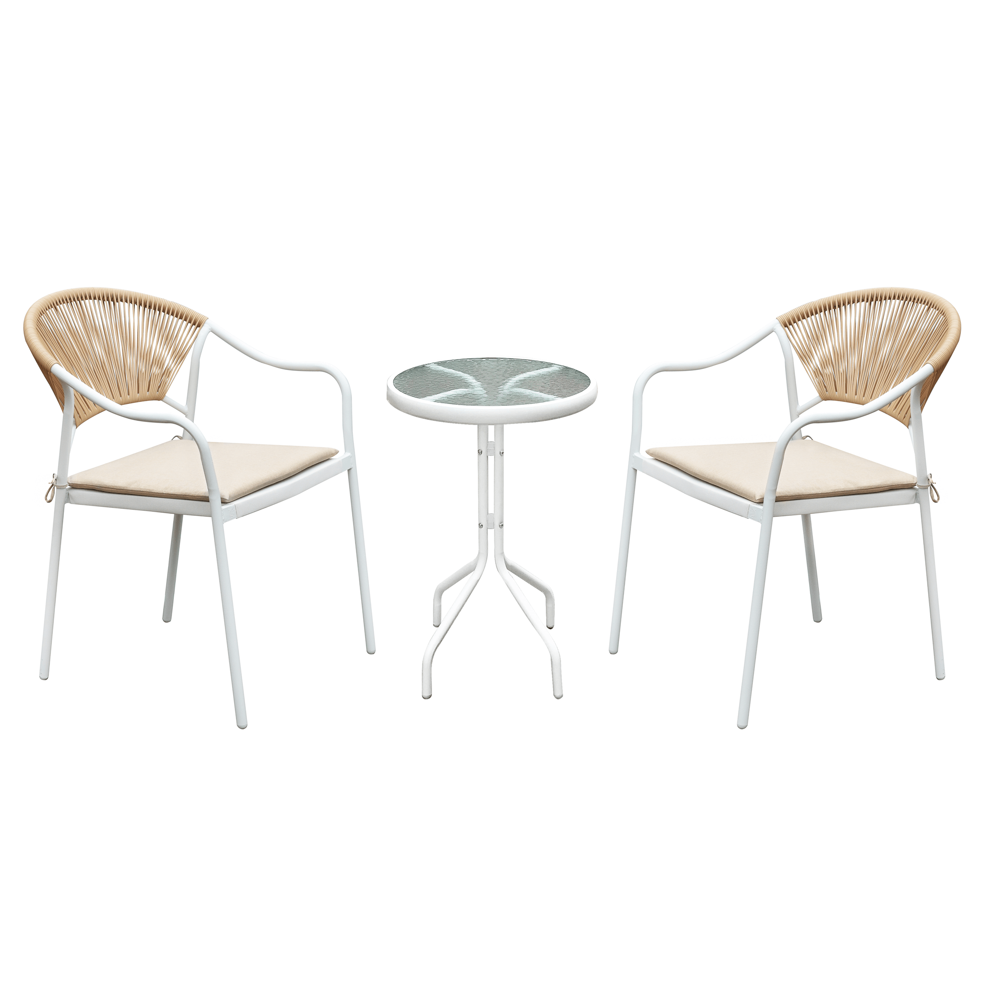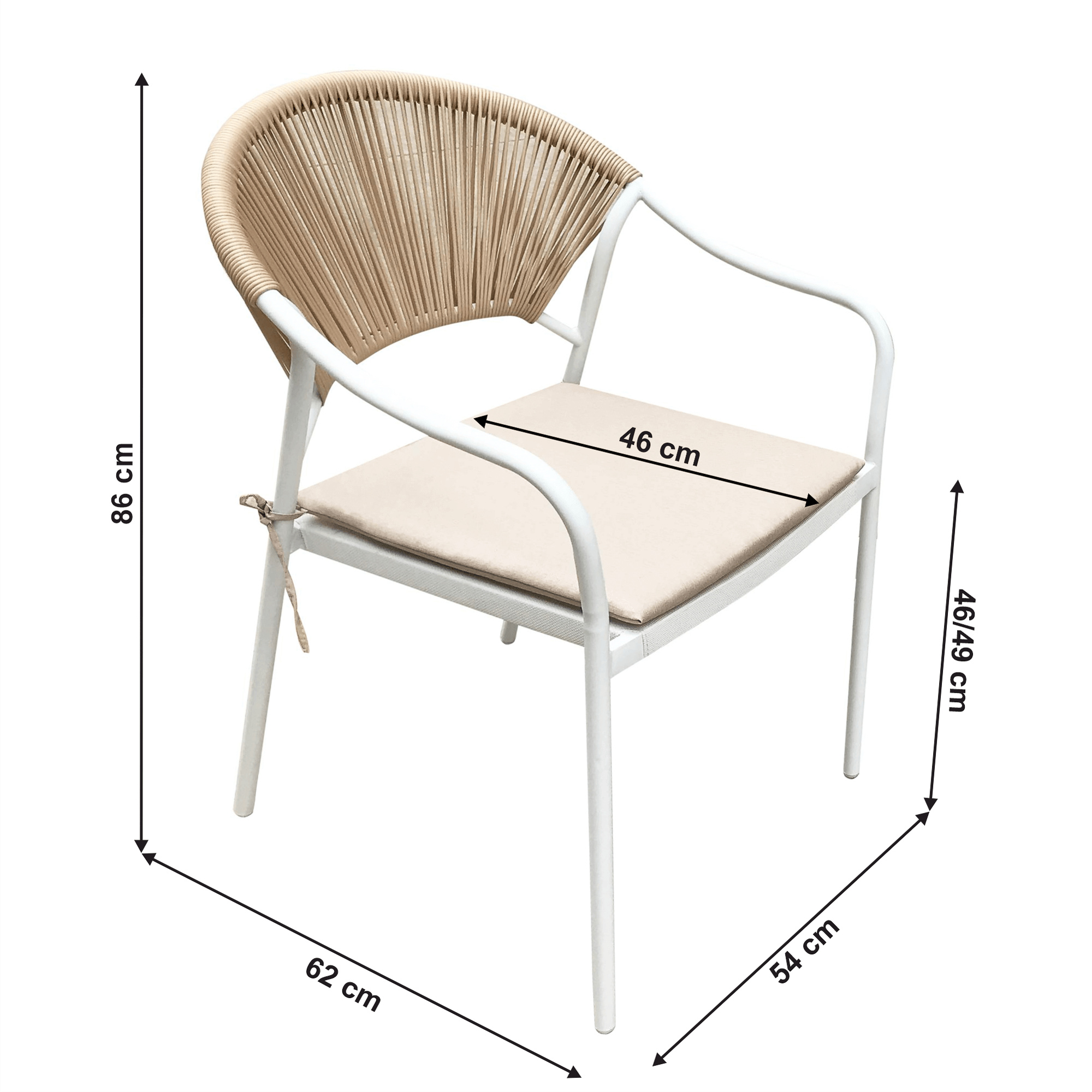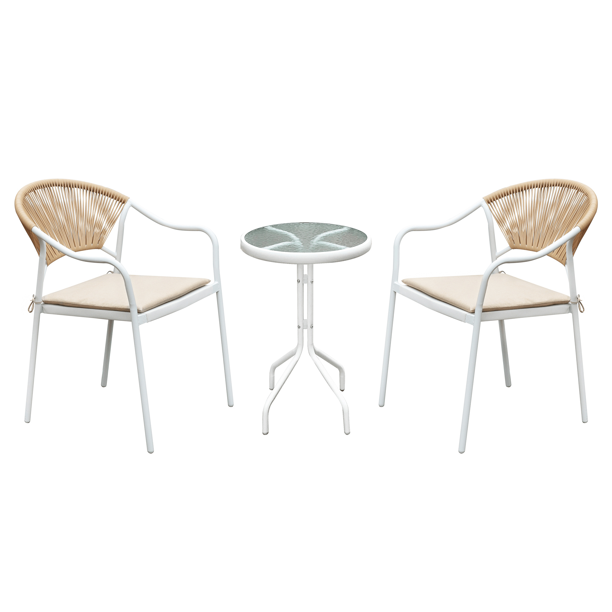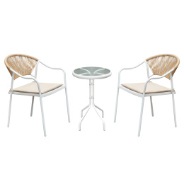 Materiál konstrukce: ocel Barva: bílá Materiál výplet: technický ratan Barva: béžová Materiál polštáře: voděodolná látka Barva: béžová Materiál deska stolu: tvrzené sklo Oděruodolnost textilie podle testu Martindale: 95 000 oděrů Rozměry stolu (průměr x V): 46x71,5 cm Nosnost stolu: 20 kg Rozměry židle (ŠxHxV): 56x60x85 cm Výška sedu: 46/43,5 cm Hloubka sedu: 46 cm Výška od země po opěrku na ruku: 66,5 cm Nosnost židle: 90kg S polštáři Rozměry polštářů (ŠxV): 46x41cm Tloušťka polštáře: 2,5 cm 3-dílná souprava Jeden stůl Dvě židle Dodáváno v monte