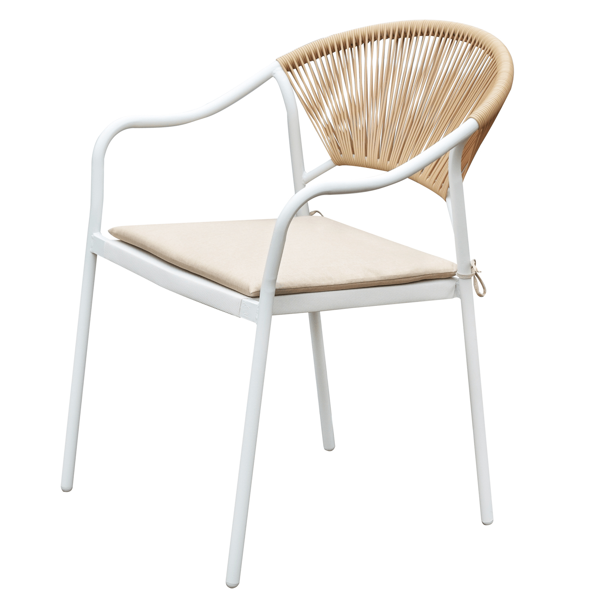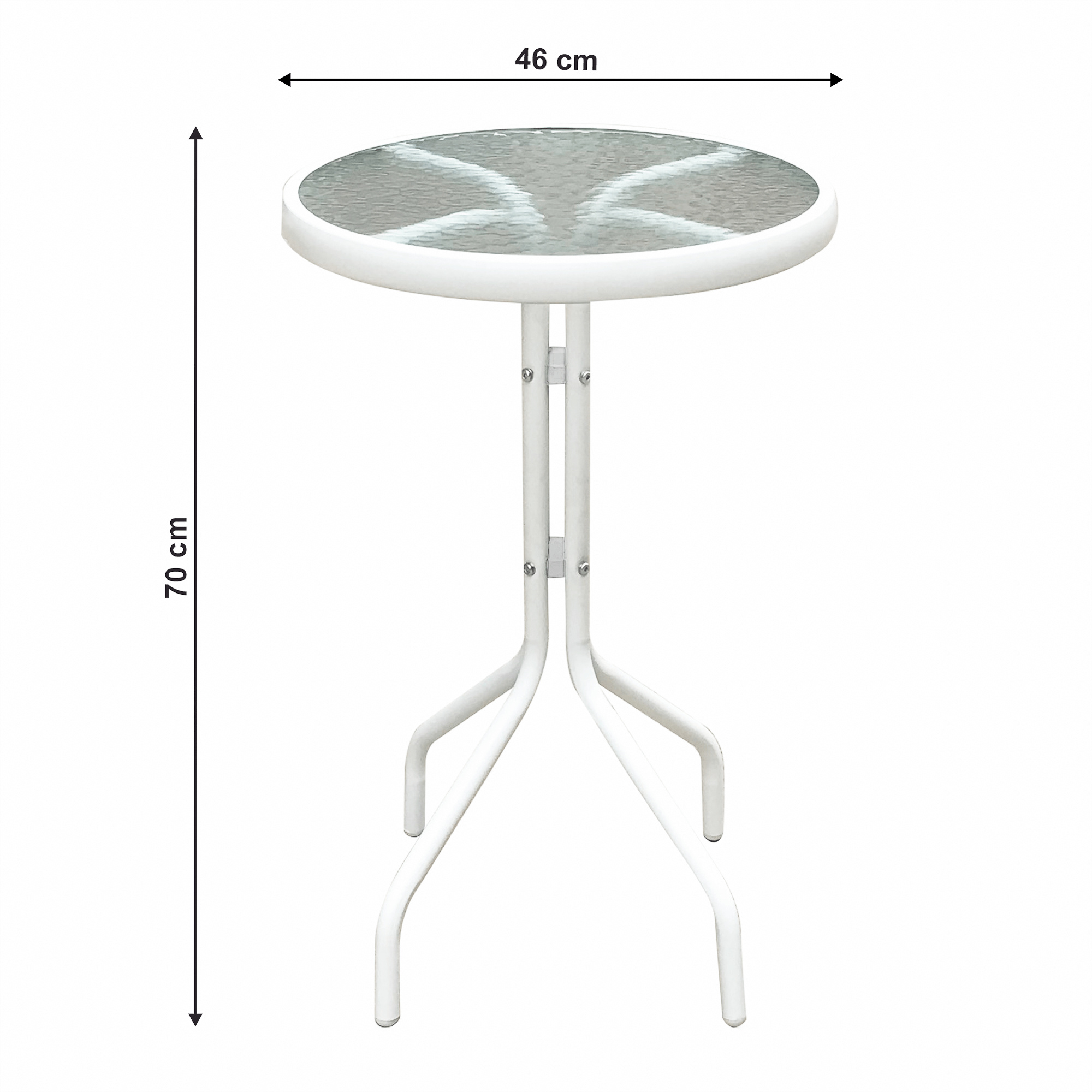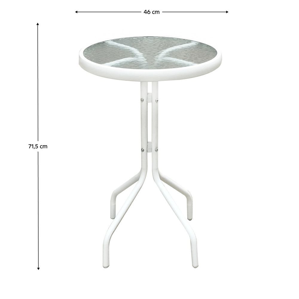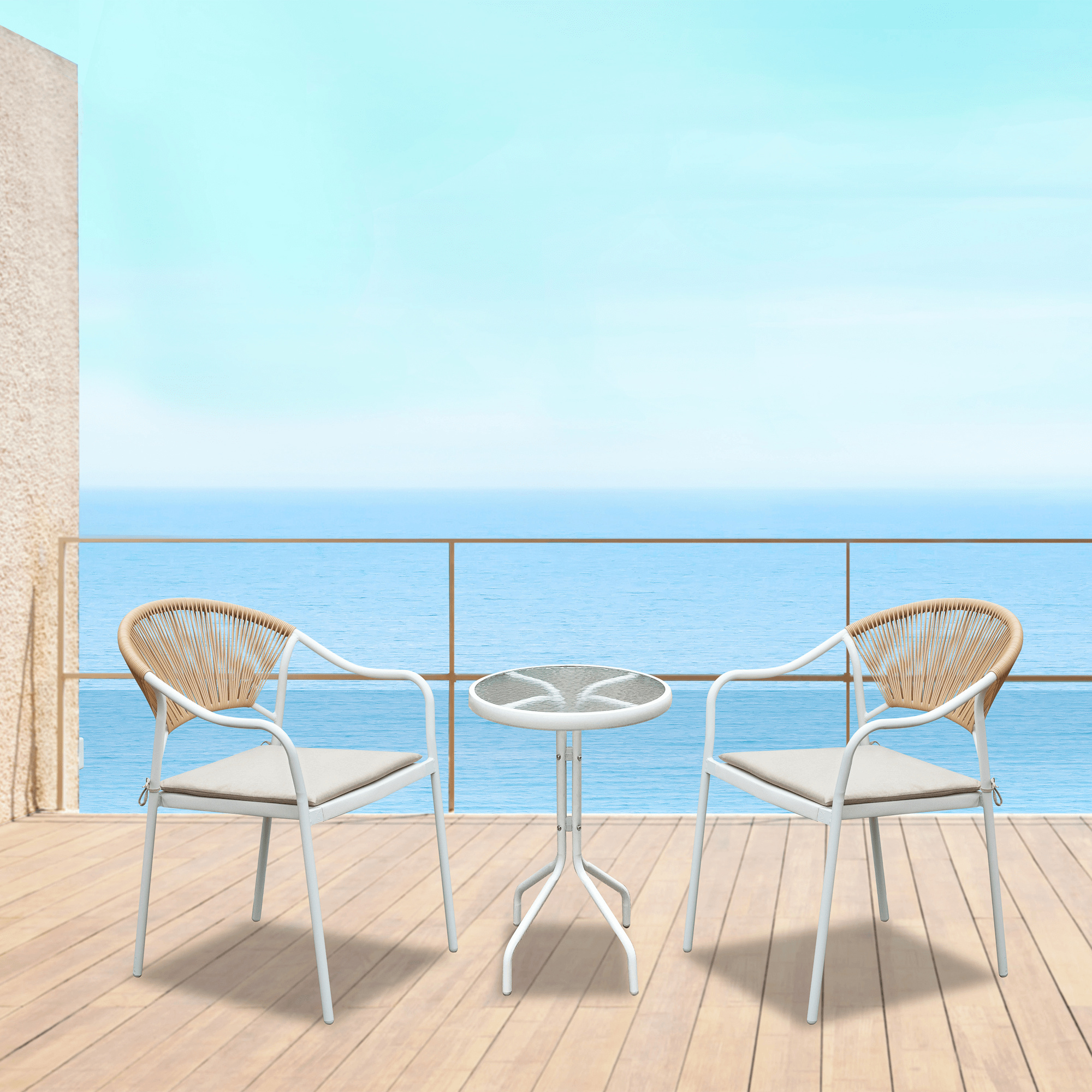 Materiál konstrukce: ocel Barva: bílá Materiál výplet: technický ratan Barva: béžová Materiál polštáře: voděodolná látka Barva: béžová Materiál deska stolu: tvrzené sklo Oděruodolnost textilie podle testu Martindale: 95 000 oděrů Rozměry stolu (průměr x V): 46x71,5 cm Nosnost stolu: 20 kg Rozměry židle (ŠxHxV): 56x60x85 cm Výška sedu: 46/43,5 cm Hloubka sedu: 46 cm Výška od země po opěrku na ruku: 66,5 cm Nosnost židle: 90kg S polštáři Rozměry polštářů (ŠxV): 46x41cm Tloušťka polštáře: 2,5 cm 3-dílná souprava Jeden stůl Dvě židle Dodáváno v monte