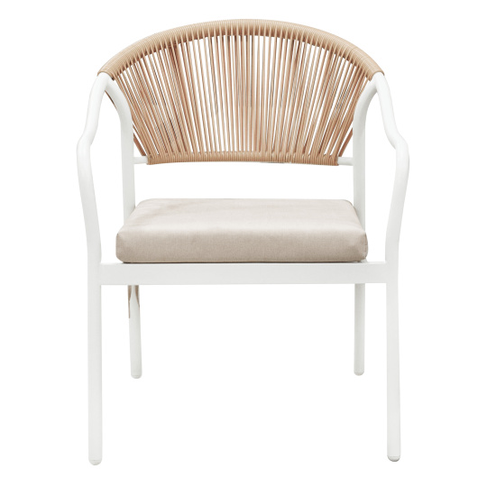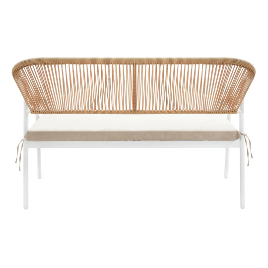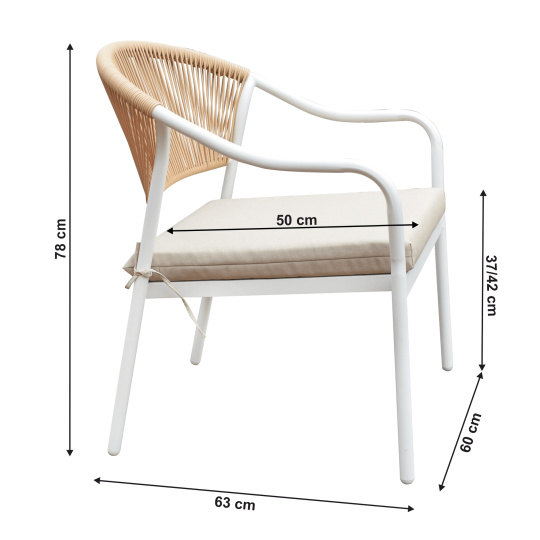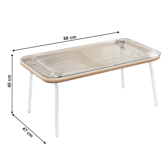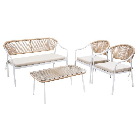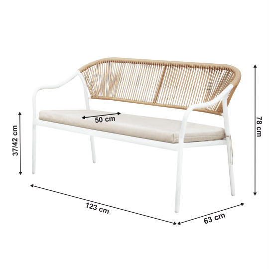 Materiál konstrukce: ocel Barva: bílá Materiál výplet: technický ratan Barva: béžová Materiál polštáře: voděodolná látka Barva: béžová Materiál deska stolu: tvrzené sklo Oděruodolnost textilie podle testu Martindale: 95 000 oděrů Rozměry stolu (ŠxHxV): 88x48x40 cm Nosnost stolu: 20 kg Tloušťka skla: 5 mm Rozměry židle (ŠxHxV): 61x63x77 cm Výška sedu: 43/38 cm Hloubka sedu: 52 cm Výška od země po opěrku na ruku: 59 cm Rozměry polštáře (ŠxV): 52x45 cm Tloušťka polštáře: 4,5 cm Nosnost na osobu: 90 kg Rozměry 2 sedu (ŠxHxV): 123x63x78 cm Výška sedu: 39/44 cm Hloubka sedu: 51,5 cm Rozměry polštáře (ŠxV): 51,5x107 cm Tloušťka polštáře: 4,5 cm S polštáři 4-dílná souprava Jeden stůl Dvě židle Jeden 2-sed Dodáváno v monte