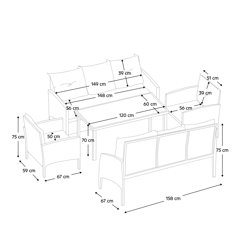 Materiál: technoratan/polyester/ocel/tvrzené sklo Barva: černá/šedá Stůl (ŠxHxV): 120x60x70 cm Křeslo (ŠxHxV): 59x67x75 cm Trojsed (ŠxHxV): 158x67x75 cm Výška sedu s polštářem: 41 cm Výška sedu bez polštáře: 36 cm Hloubka sedu: 56 cm Šířka sedu křesla: 50 cm Šířka zad křesla: 51 cm Šířka sedu trojsedu: 148 cm Šířka zad trojsedu: 149 cm Výška zad 39 cm Nosnost křesla: 100 kg Nosnost lavice: 90 kg na osobu Nosnost stolu: 70 kg 5-dílná souprava 2x ratanový trojsed 2x ratenová křesla Se stolem S tvrzeným sklem (5 mm) Dodáváno bez dekorativních polštářků Tloušťka polštáře: 5 cm Dodáváno s polštáři Snímatelný voděodolný potah Potahy lze prát při teplotě 30°C Dodáváno v demontu