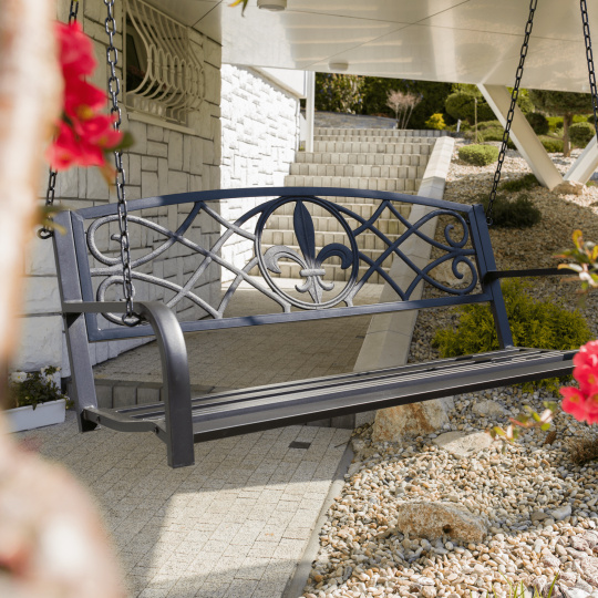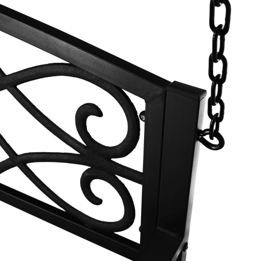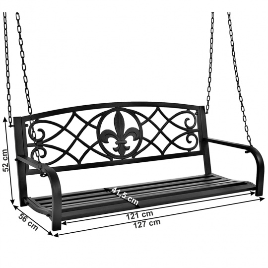 Materiál: ocel Barva: černá Rozměry (ŠxHxV): 127x56x52 cm Šířka sedu: 121 cm Hloubka sedu: 41,5 Nosnost: 170 kg S řetězem Délka řetězů: 3,4 m Romantický design Ornamenty na opěrce zad Vhodná do interiéru i exteriéru Na balkony, terasy, do zahrady Dodávána bez polštářů Dodávána bez stojanu Dodávané v demontu