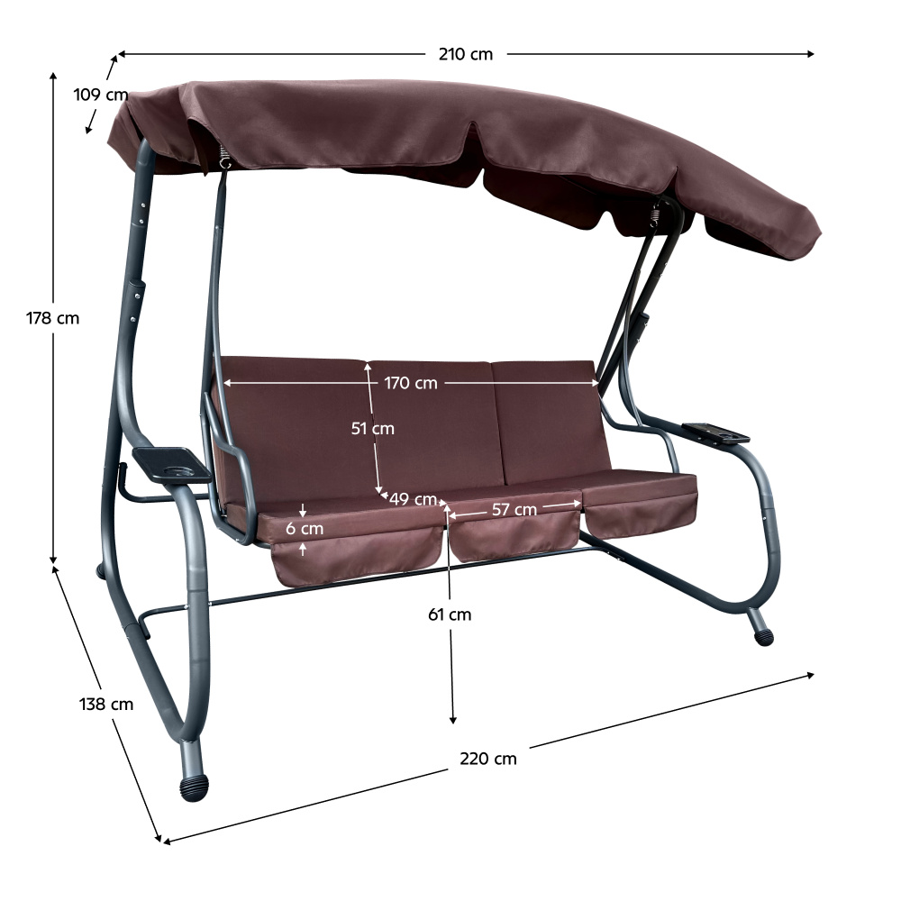 Materiál: látka/kov Barva: hnědá/tmavě šedá Rozměry (ŠxHxV): 220x138x178 cm Výška sedu: 61 cm Hloubka sedu: 49 cm Výška zad: 51 cm Šířka zad: 170 cm Nosnost na osobu: 90 kg Voděodolné potahy Tloušťka potahu: 6 cm Potah upevněný suchým zipem Kovová konstrukce Hnědá stříška Rozměr stříšky (ŠxV): 210x109 cm Dodáváno v demontu