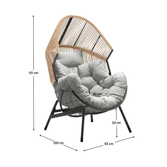 Materiál: ocel/umělý ratan/tkanina Oděruodolnost textilie podle testu Martindale: 95 000 oděrů Barva: černá/hnědá/šedá Rozměry (ŠxHxV): 83x100x131 cm Výška sedu: 20 cm Hloubka sedu: 90 cm Nosnost: 150 kg Vhodné do interiéru i exteriéru V exteriéru doporučujeme chránit výrobek před nepříznivými povětrnostními vlivy Dodáváno s polštáři Rozměr polštářku (ŠxHxV): 100x90x31 cm Rozměr polštáře (ŠxHxV): 40x23x16 cm Voděodolné potahy Polypropylenové vlákno Na nožičkách Dodáváno v demontu
