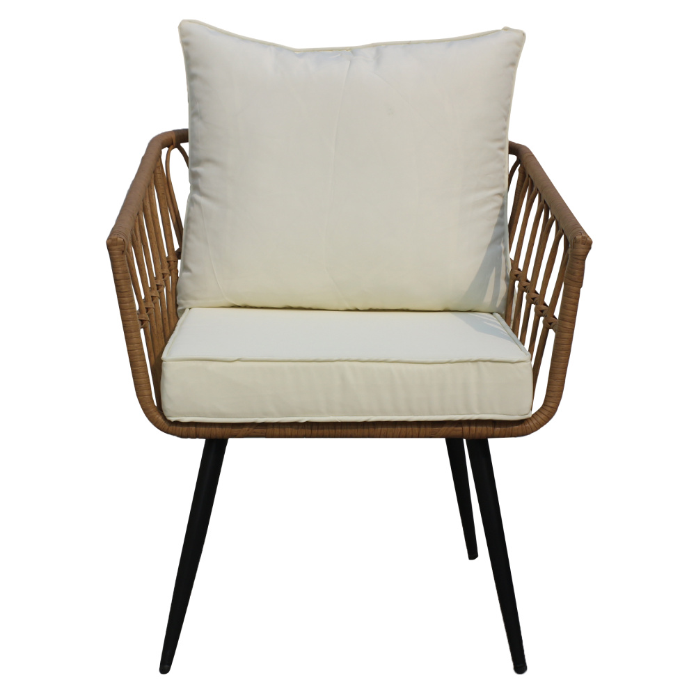 Materiál: technoratan/látka/kov Barva: přírodní/béžová/černá Oděruodolnost textilie podle testu Martindale: 95 000 oděrů Rozměry (ŠxHxV): 64x66x75 cm Výška sedu: 44 cm Hloubka sedu: 41/49 cm Šířka sedu: 55 cm Dodáváno s polštáři Rozměr polštáře (ŠxV): 54x47 cm Tloušťka polštáře: 8 cm Nosnost na osobu: 90 kg Voděodolný potah na polštáři Dodáváno v demontu