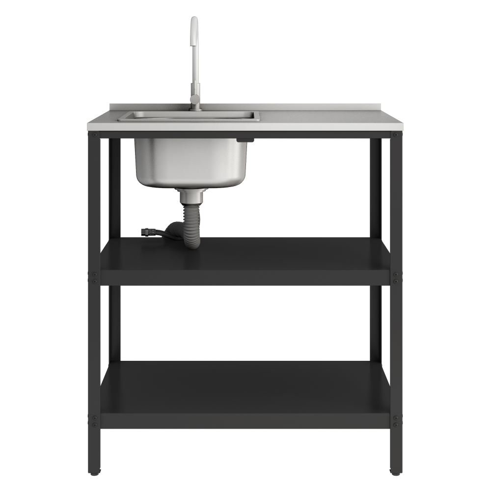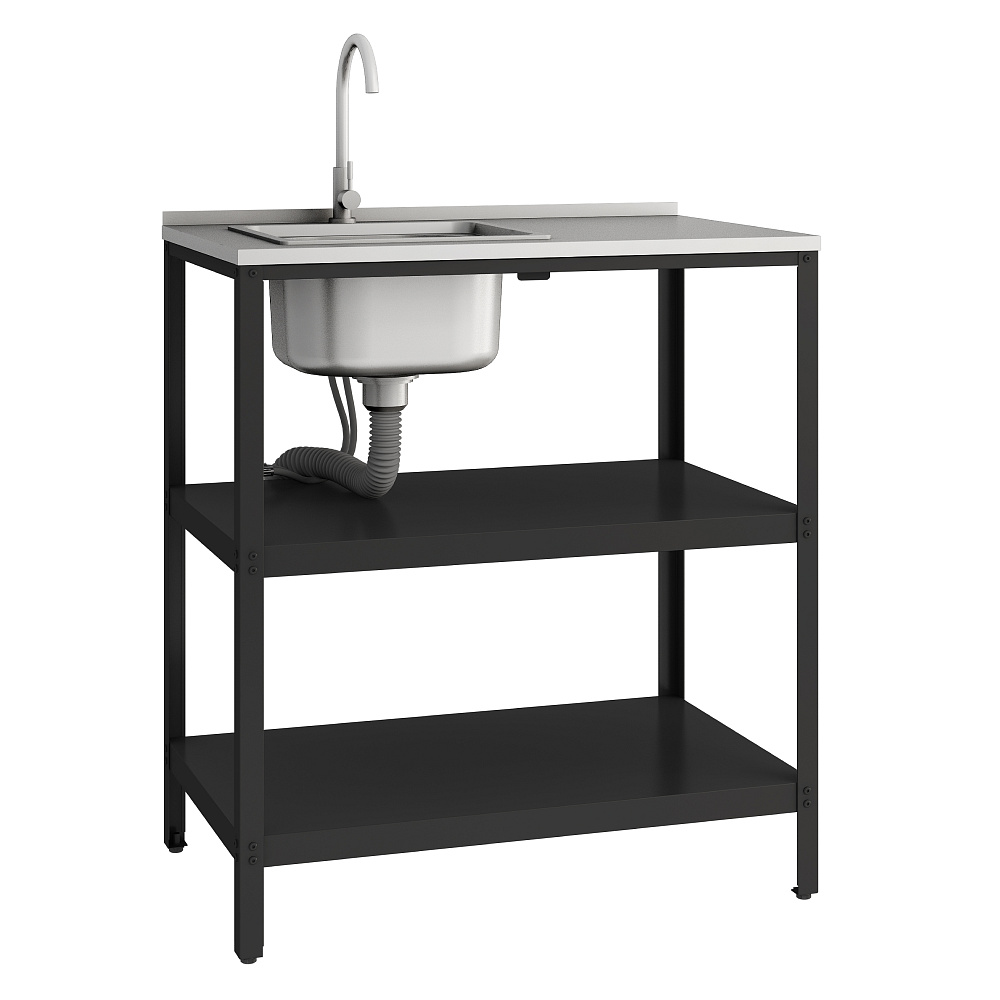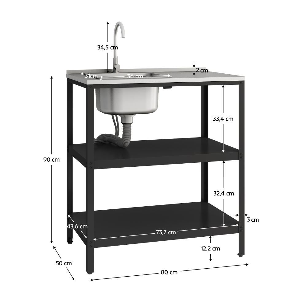 Materiál: nerezová ocel s práškovým lakováním Barva: černá/stříbrná Rozměry (ŠxHxV): 80x50x92 cm Tloušťka materiálu: 0,6-1,2 mm Nosnost: 30 kg Dvě police Nosnost police: 20 kg S dřezem Rozměry dřezu (ŠxHxV): 38x33x17,5 cm Vnitřní rozměry dřezu (ŠxHxV): 32x27x16 cm Dodáváno s vodovodní baterií Rektifikační šrouby na nohou Navržena pro venkovní použití Ideální řešení k bazénu, na zahradu, na terasu nebo do altánku Stabilní rám odolný vůči korozi Odolná vůči UV záření, větru, nečistotám Doporučujeme umístit na pevném a rovném povrchu (např. na dlážděné, betonové podlaze Přístup k vodovodnímu systému Na povrch neumisťujte žádné horké předměty Uchovávejte mimo dosah tepelných zdrojů (gril, ohniště) Po skončení sezóny se doporučuje linku skladovat pod ochrannou plachtou, v suché a chladné místnosti Prach otírejte měkkým hadříkem Čistěte mýdlovou vodou, jemným čistícím prostředkem V exteriéru chraňte výrobek před nepříznivými povětrnostními vlivy (silný déšť, silný vítr, krupobití, silné sluneční záření a jiné) V exteriéru doporučujeme zajistit ochranným krytem nebo plachtou Kombinovatelné s dalšími prvky série INES Dostupná i kompletní hotová zahradní kuchyně INES Dodáváno v demontu