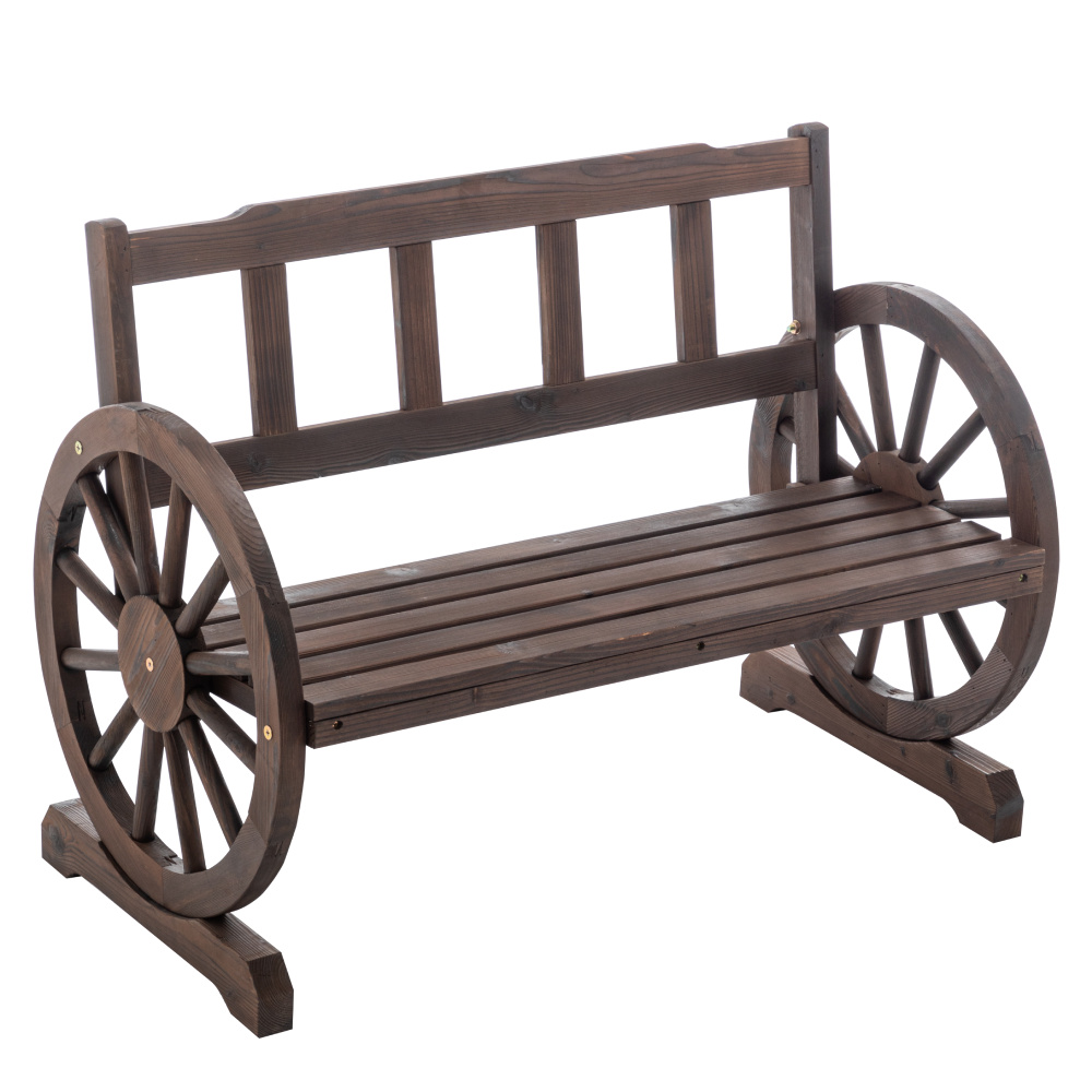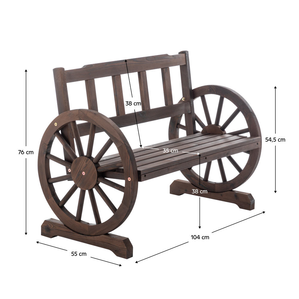 Materiál: borové dřevo Barva: hnědá Rozměry (ŠxHxV): 104x55x76 cm Šířka sezení: 95,5 cm Výška sezení: 38 cm Hloubka sezení: 35 cm Výška opěrky zad: 38 cm Průměr kola: 54,5 cm Tloušťka materiálu: 1,8-4,5 cm Nosnost: 170 kg Opěrky na ruku ve tvaru kola Na zahradu nebo terasu Venkovský styl Odolný vůči povětrnostním podmínkám Doporučujeme výrobek chránit před nepříznivými povětrnostními podmínkami, aby se prodloužila životnost výrobku Dodávána v demontu