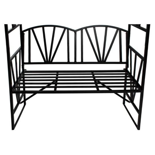 Materiál: kov Barva: černá Rozměry (ŠxHxV): 114x42x210 cm Šířka sezení: 110 cm Výška sezení: 46 cm Hloubka sezení: 40 cm Nosnost: 160 kg Hmotnost: 13 kg S pergolou Elegantní design Romantický vzhled Na zahradu nebo terasu Dodávána v demontu