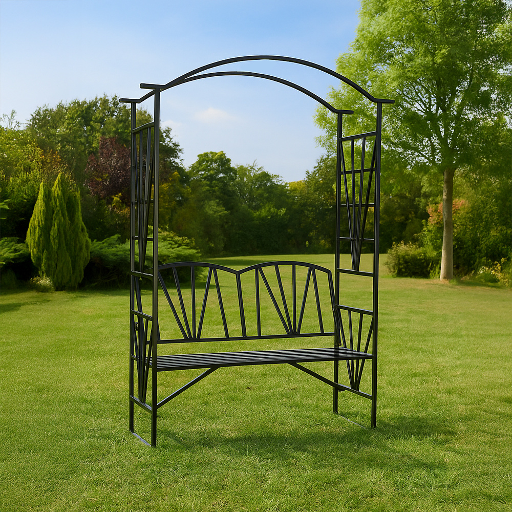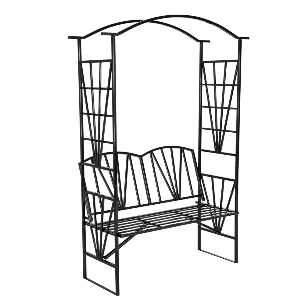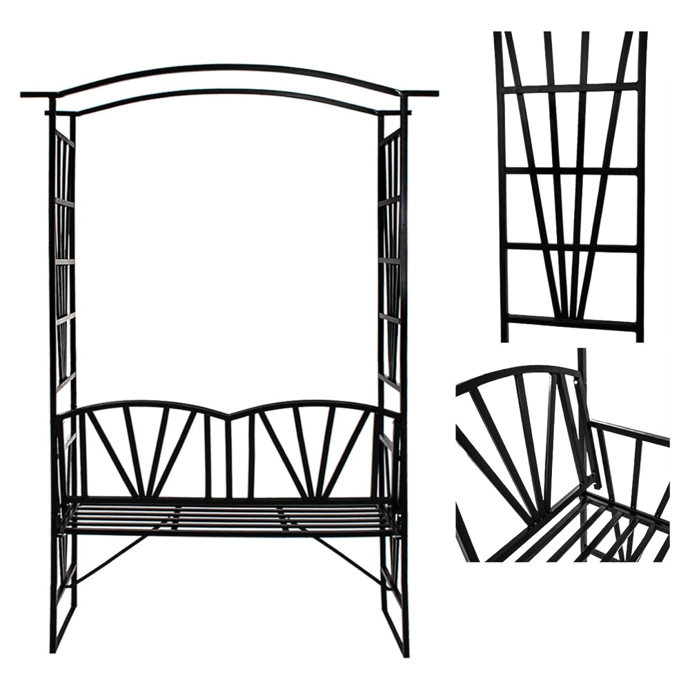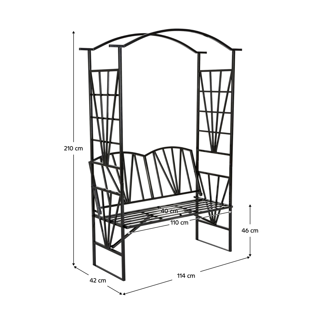 Materiál: kov Barva: černá Rozměry (ŠxHxV): 114x42x210 cm Šířka sezení: 110 cm Výška sezení: 46 cm Hloubka sezení: 40 cm Nosnost: 160 kg Hmotnost: 13 kg S pergolou Elegantní design Romantický vzhled Na zahradu nebo terasu Dodávána v demontu
