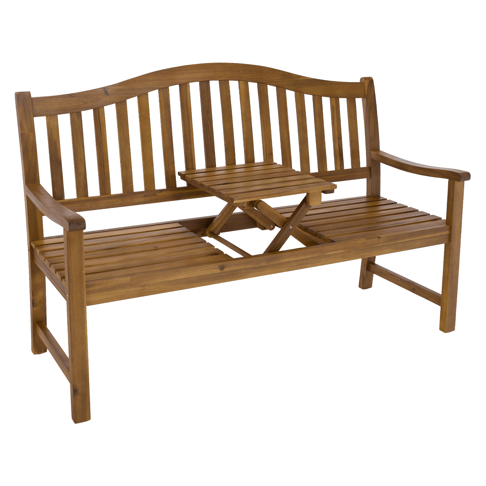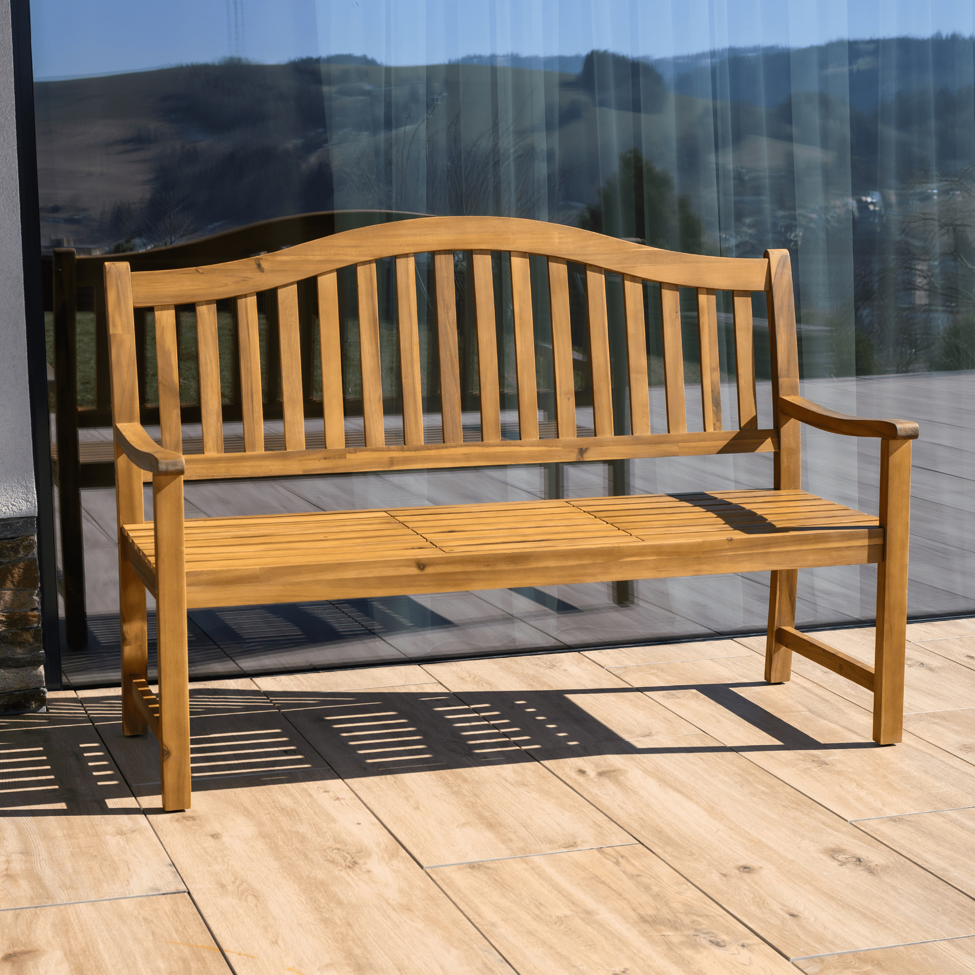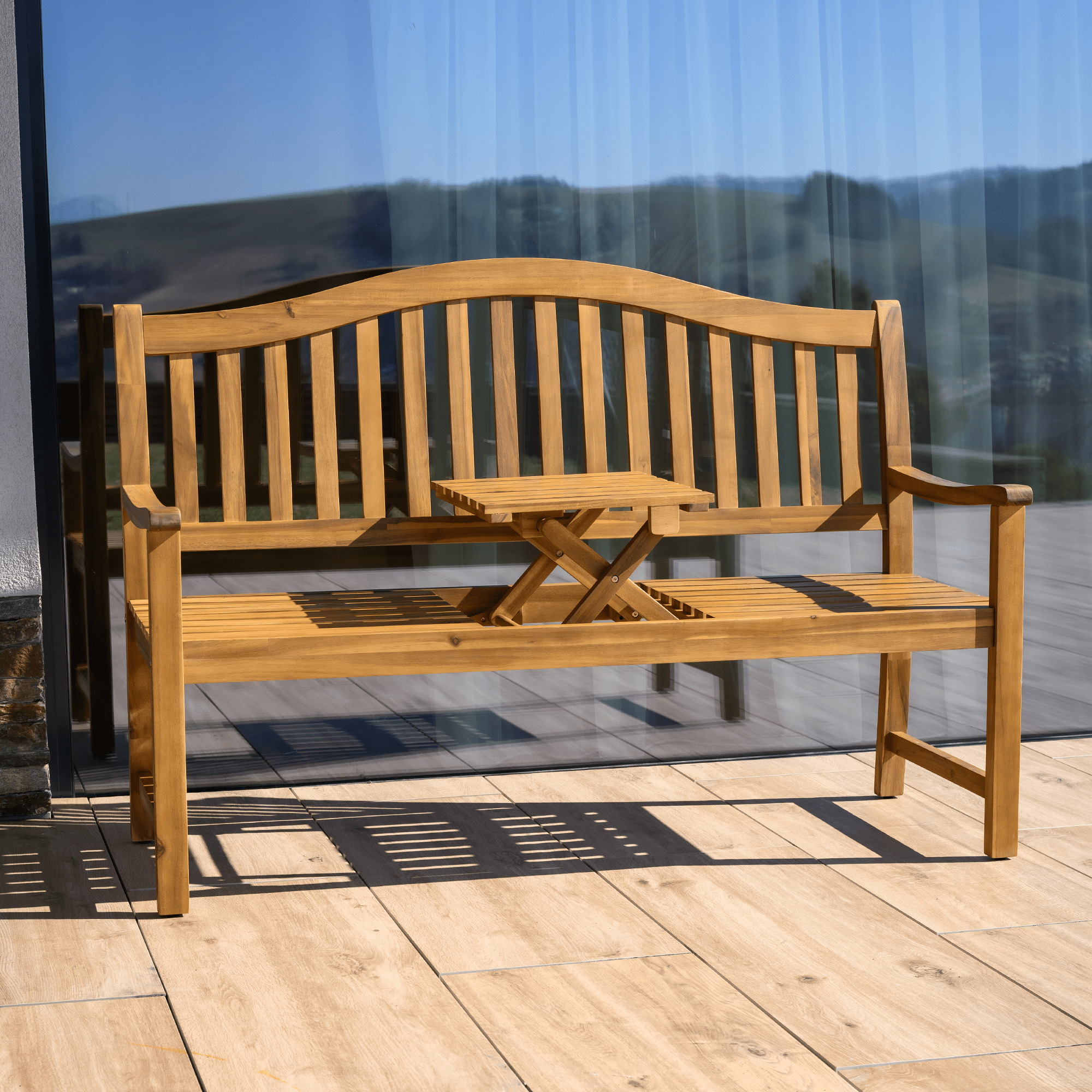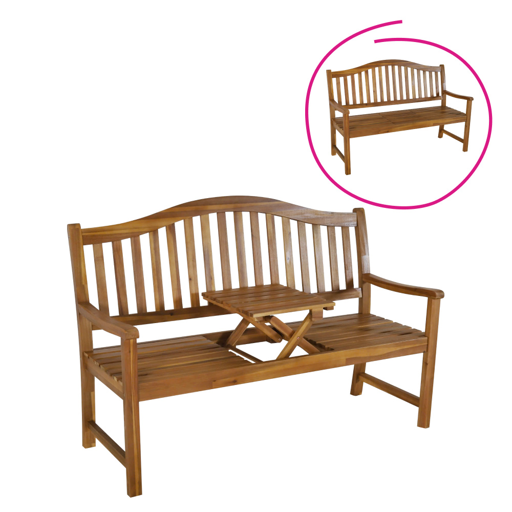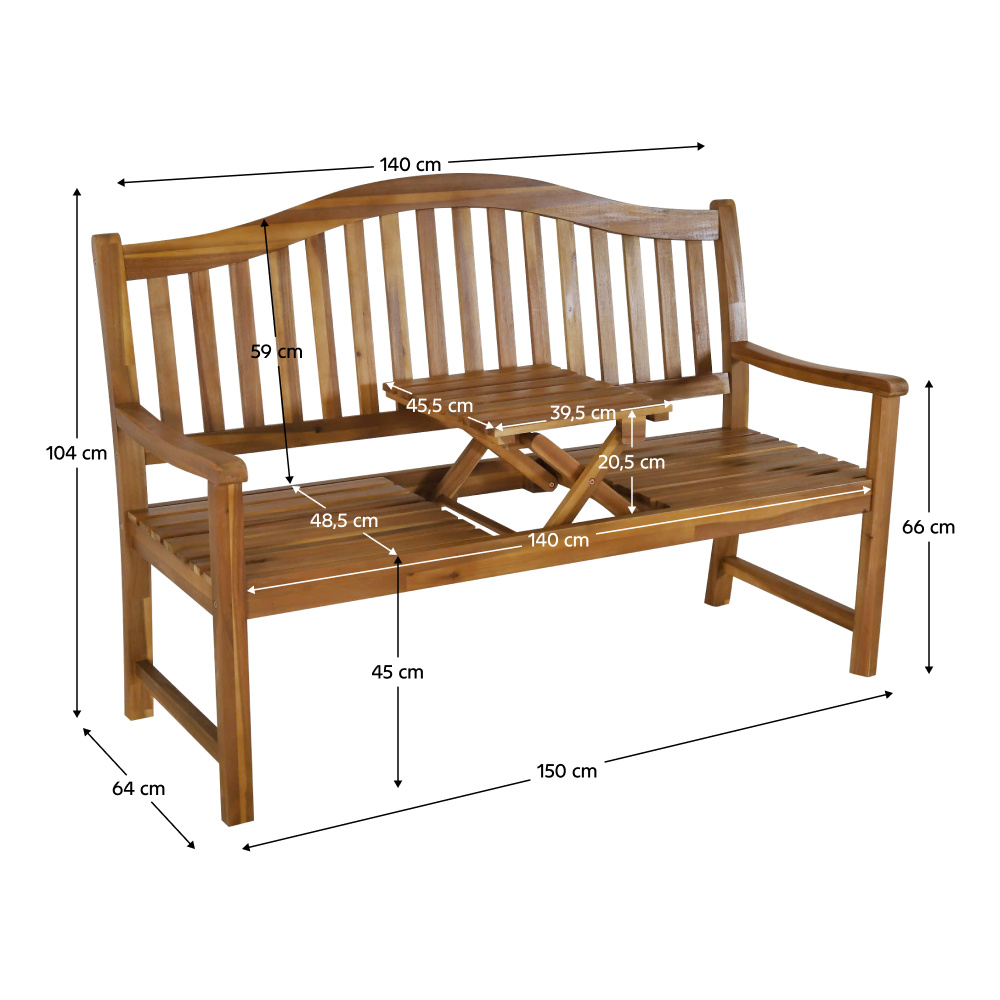 Materiál: masivní akáciové dřevo Barva: akácie Rozměry (ŠxHxV): 150x64x104 cm Šířka sezení: 140 cm Výška sezení: 45 cm Hloubka sezení: 48,5 cm Výška opěrky zad: 59 cm Šířka opěrky zad: 140 cm Výška od země po opěrku na ruce: 66 cm Nosnost: 170 kg Hmotnost: 19 kg S výsuvným stolkem Rozměry stolku (ŠxHxV): 39,5x45,5x20,5 cm Zaoblené opěradlo Odolný vůči povětrnostním podmínkám Doporučujeme výrobek chránit před nepříznivými povětrnostními podmínkami, aby se prodloužila životnost výrobku Praktická Moderní Dodávána v demontu