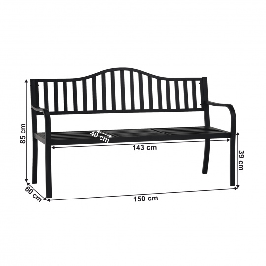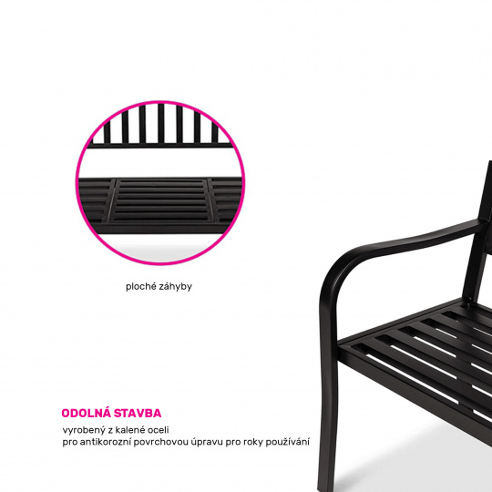 Materiál: kov Barva: černá Rozměry (ŠxHxV): 131x49x89 cm Výška sedu: 43 cm Hloubka sedu: 42 cm Šířka sedu: 98,5 cm Nosnost: 150 kg Dodávané bez polštářů romantický vzhled S ozdobnými prvky Dodávané v demontu Hmotnost: 10.8kg