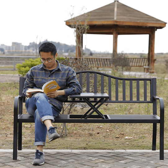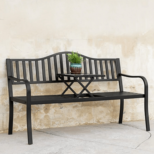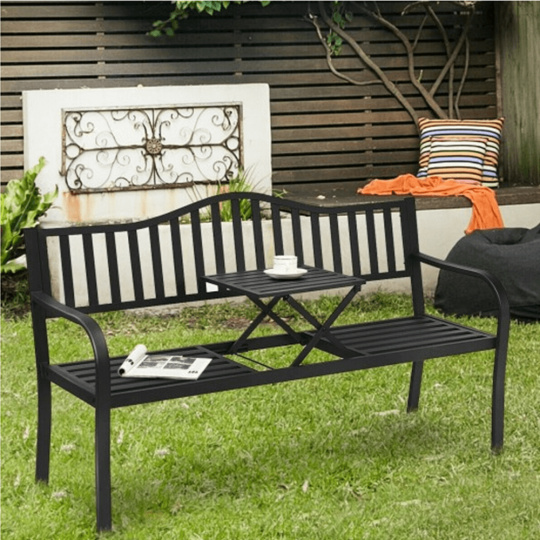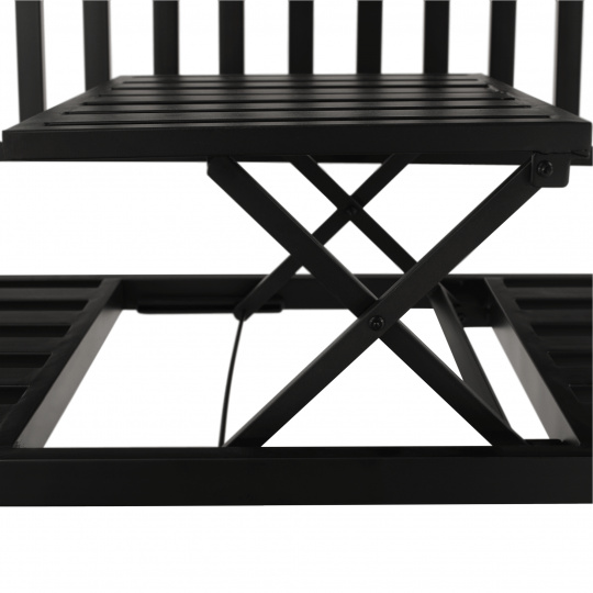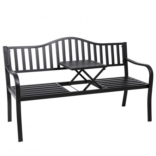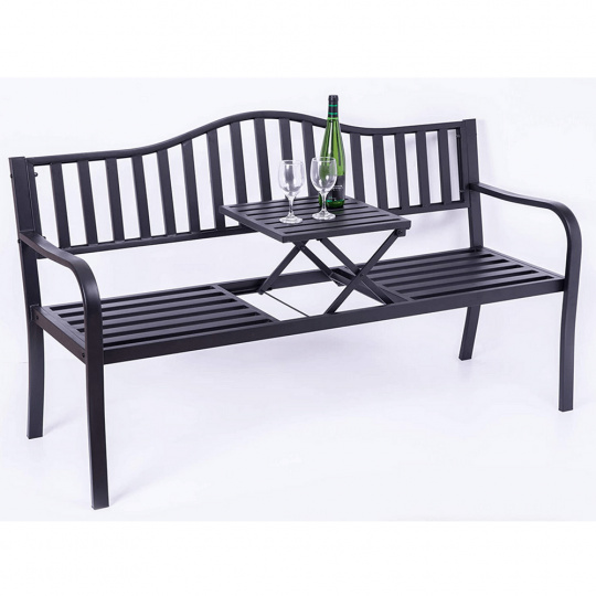 Materiál: ocel Barva: černá Rozměry (ŠxHxV): 150x60x85 cm Šírka sedu: 143 cm Výška sedu: 39 cm Hloubka sedu: 40 cm sklopné stolek 2-sed se stolkem moderní design Nosnost: 170 kg Dodávané v demontu