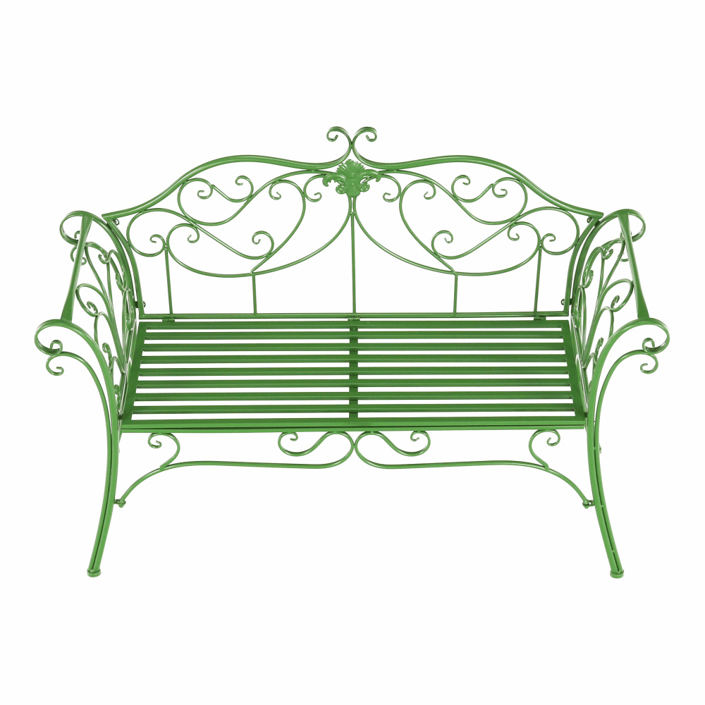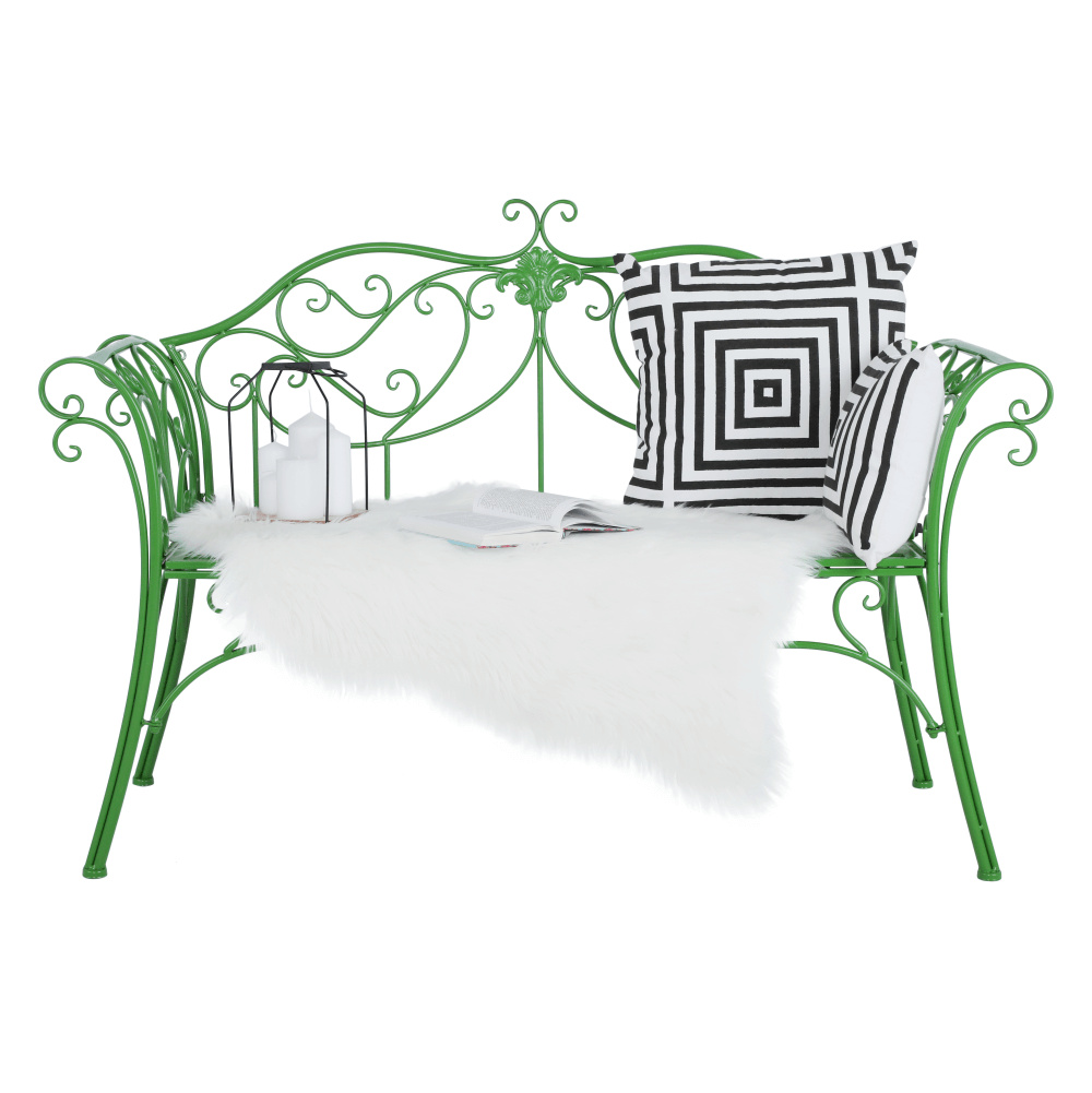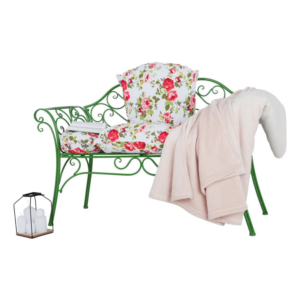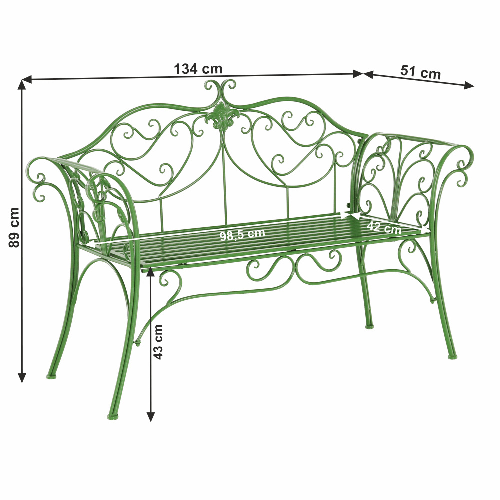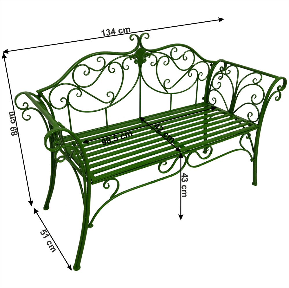 Materiál: kov Barva: zelená Rozměry (ŠxHxV): 131x49x89 cm Výška sedu: 43 cm Hloubka sedu: 42 cm Šířka sedu: 98,5 cm Nosnost: 150 kg Dodávané bez polštářů romantický vzhled S ozdobnými prvky Dodávané v demontu