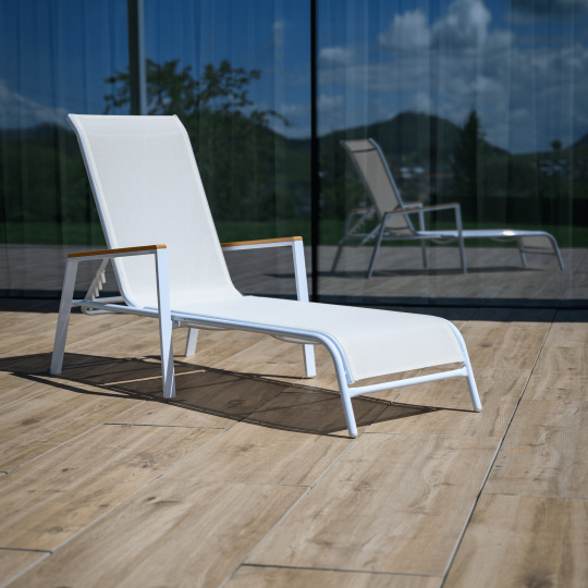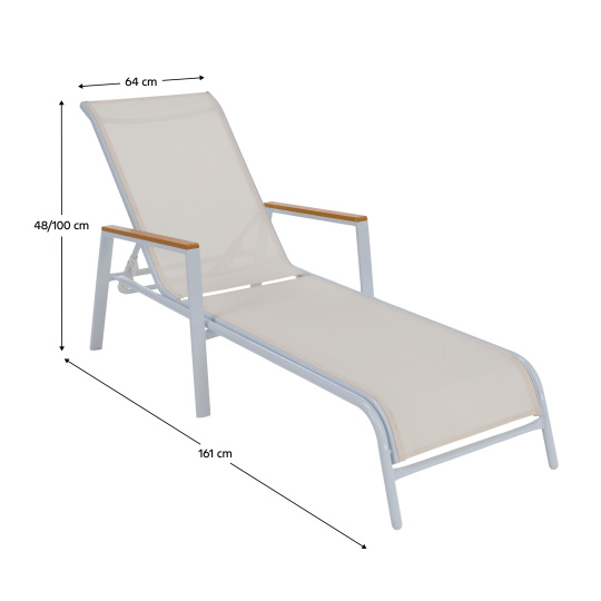 Materiál: ocel/umělá textilie/polywood Barva: bílá/dub Rozměry (ŠxHxV): 64x161x48/100 cm Výška sedu: 28 cm Hloubka sedu: 104 cm Celková hloubka po sklopení: 195 cm Nosnost: 100 kg Zahradní Stohovatelné Polohovací 5 pozic sklápění opěradla S područkami Dodáváno v monte