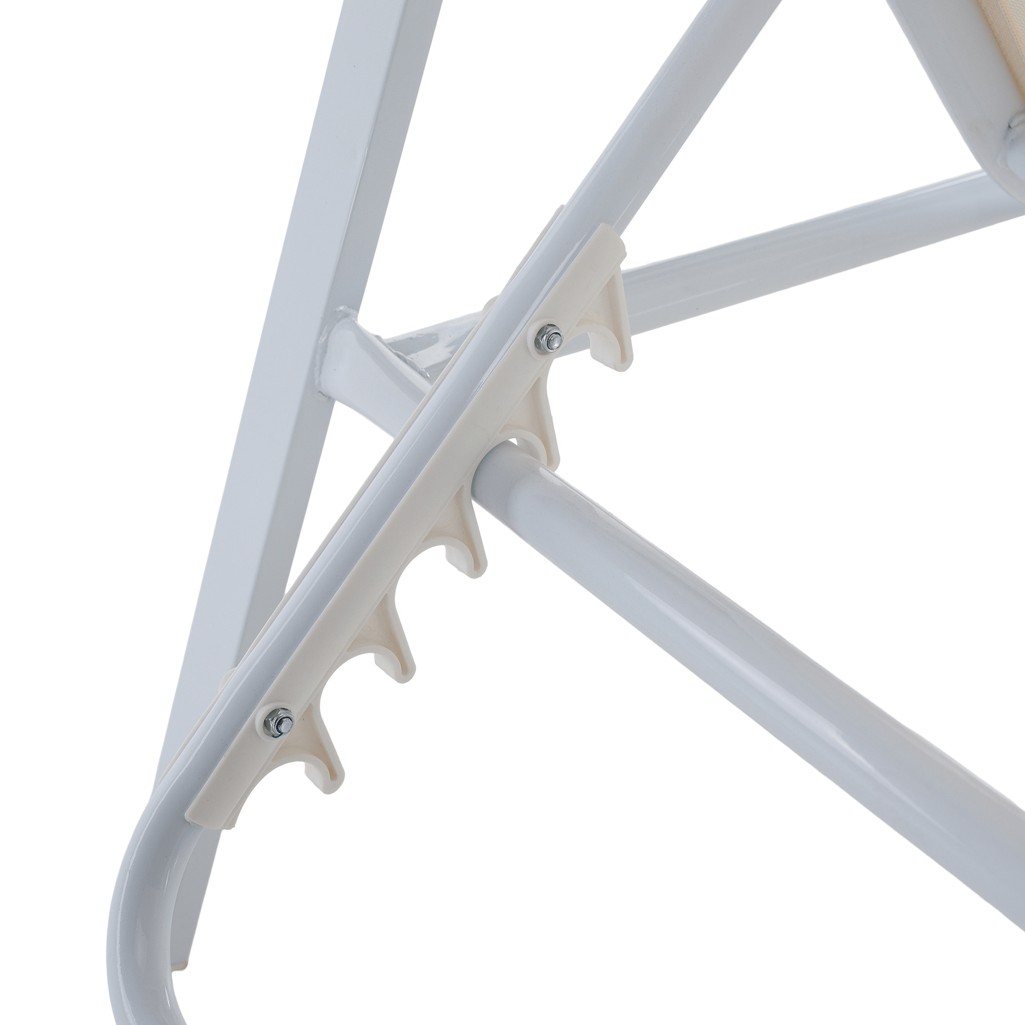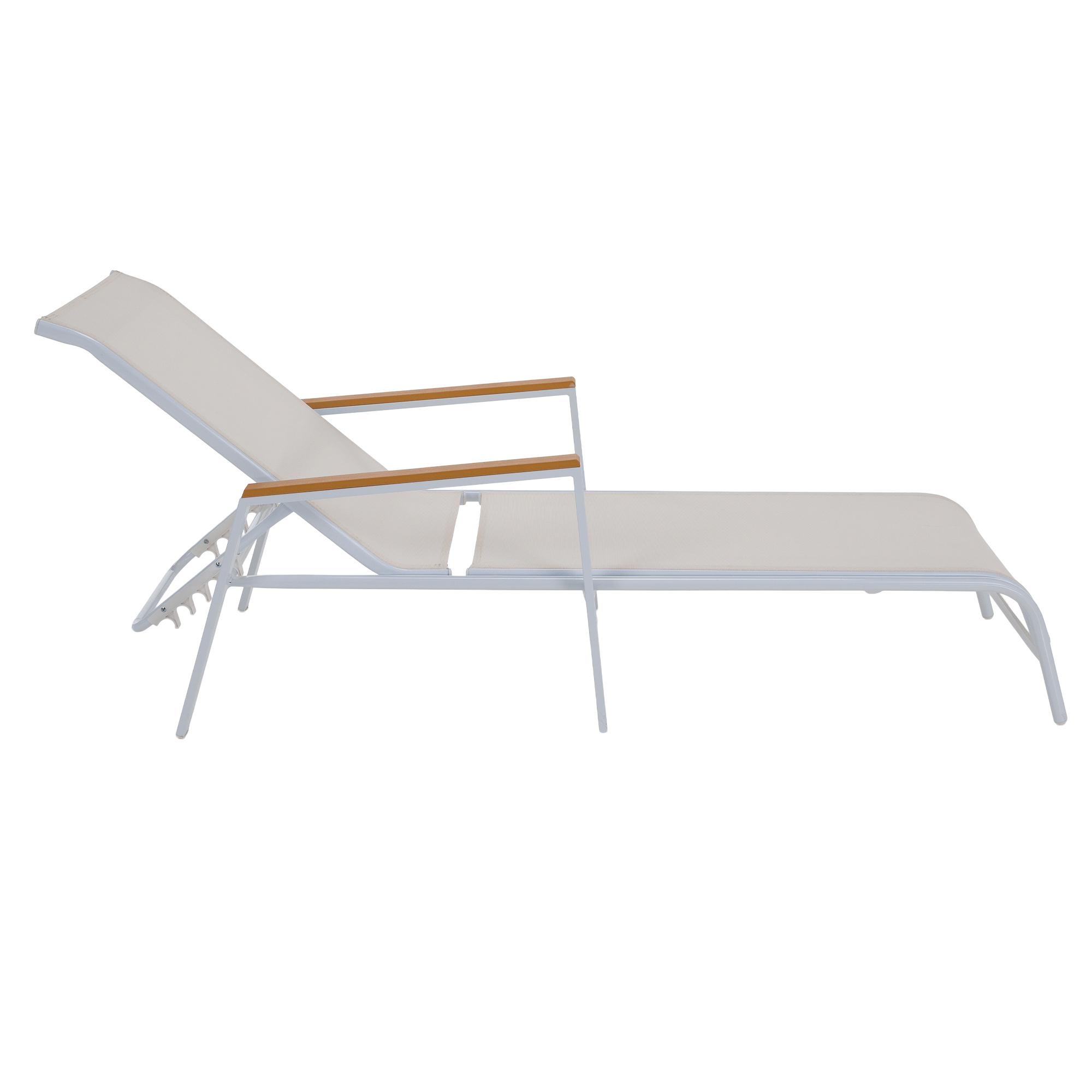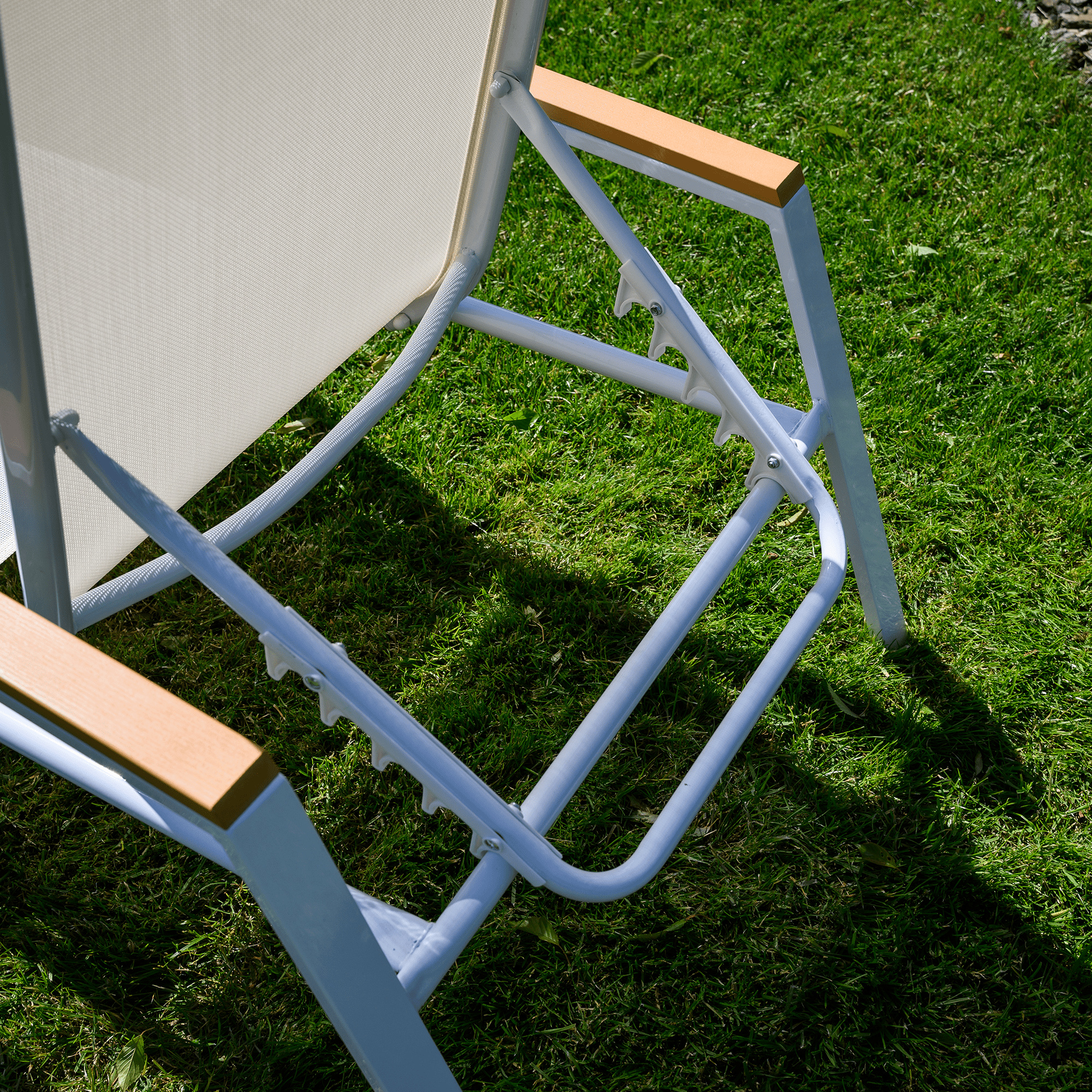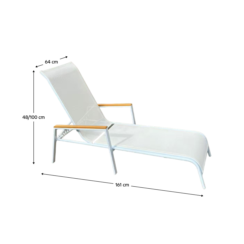 Materiál: ocel/umělá textilie/polywood Barva: bílá/dub Rozměry (ŠxHxV): 64x161x48/100 cm Výška sedu: 28 cm Hloubka sedu: 104 cm Celková hloubka po sklopení: 195 cm Nosnost: 100 kg Zahradní Stohovatelné Polohovací 5 pozic sklápění opěradla S područkami Dodáváno v monte